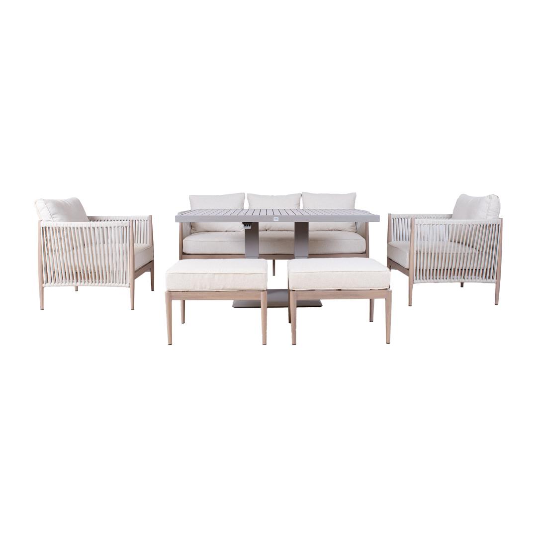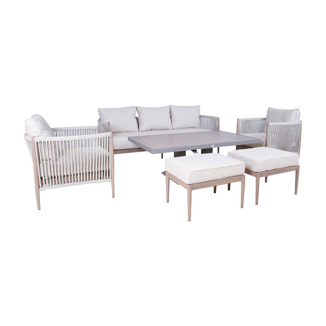 Aiamööblikomplekt MEDINA laud, diivan, 2 tugitooli ja 2 tumbat, beež