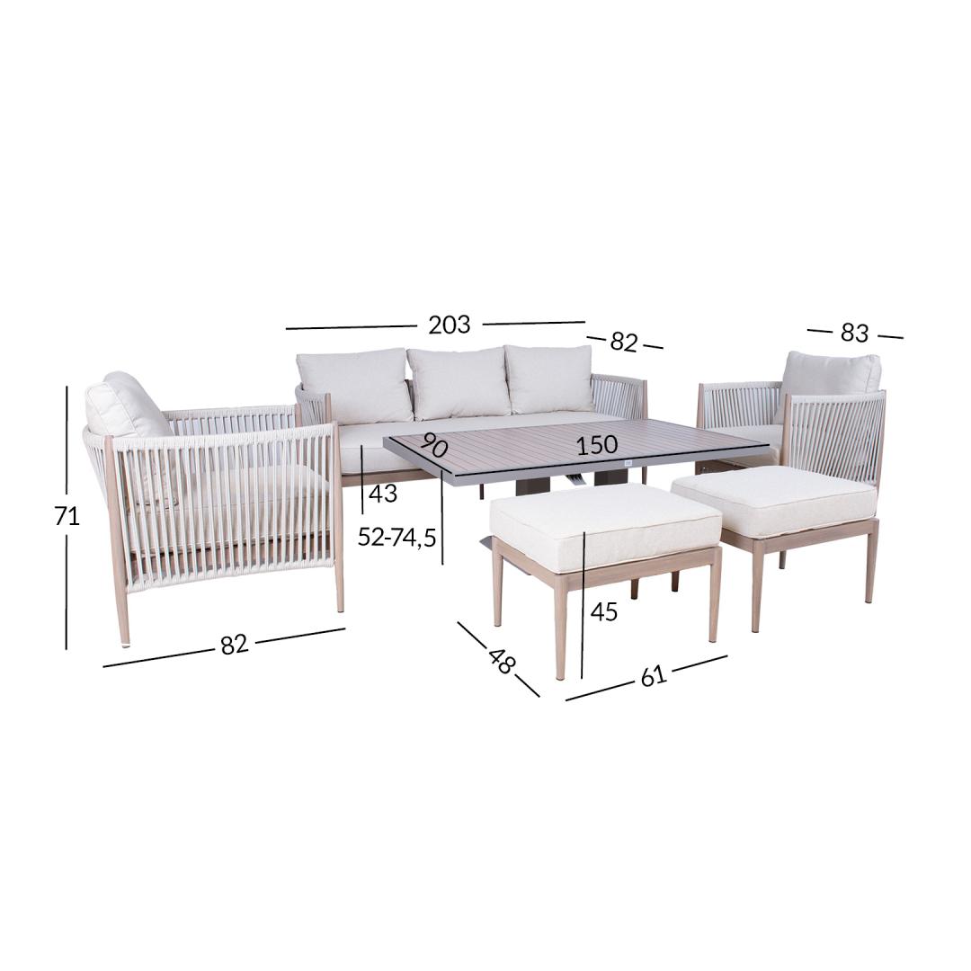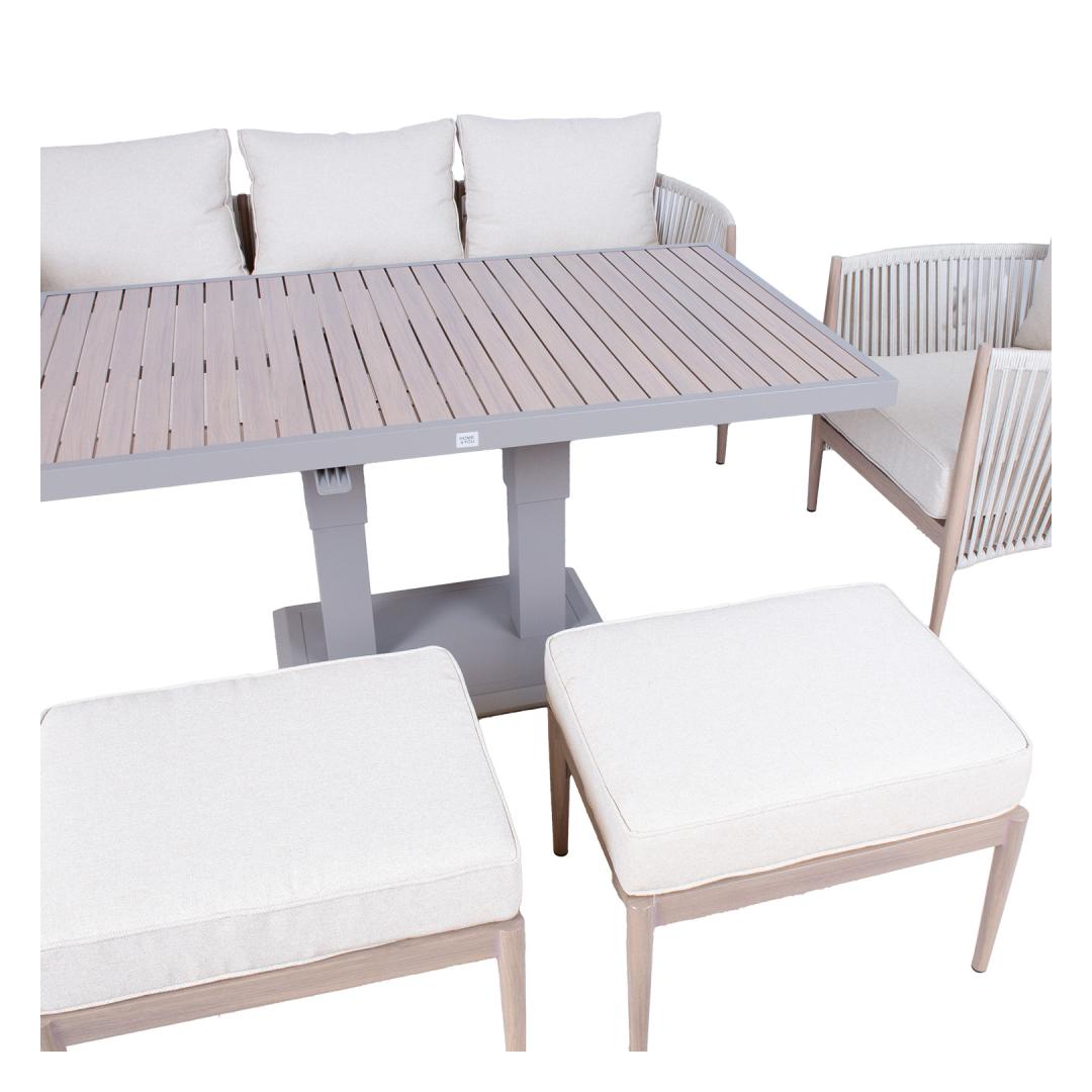 Aiamööblikomplekt MEDINA muudetava kõrgusega laud, 3-kohaline diivan, 2 tugitooli ja 2 tumbat, beež.