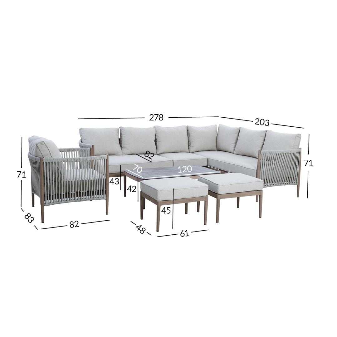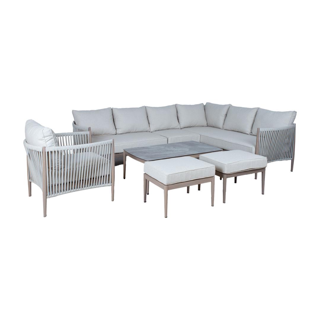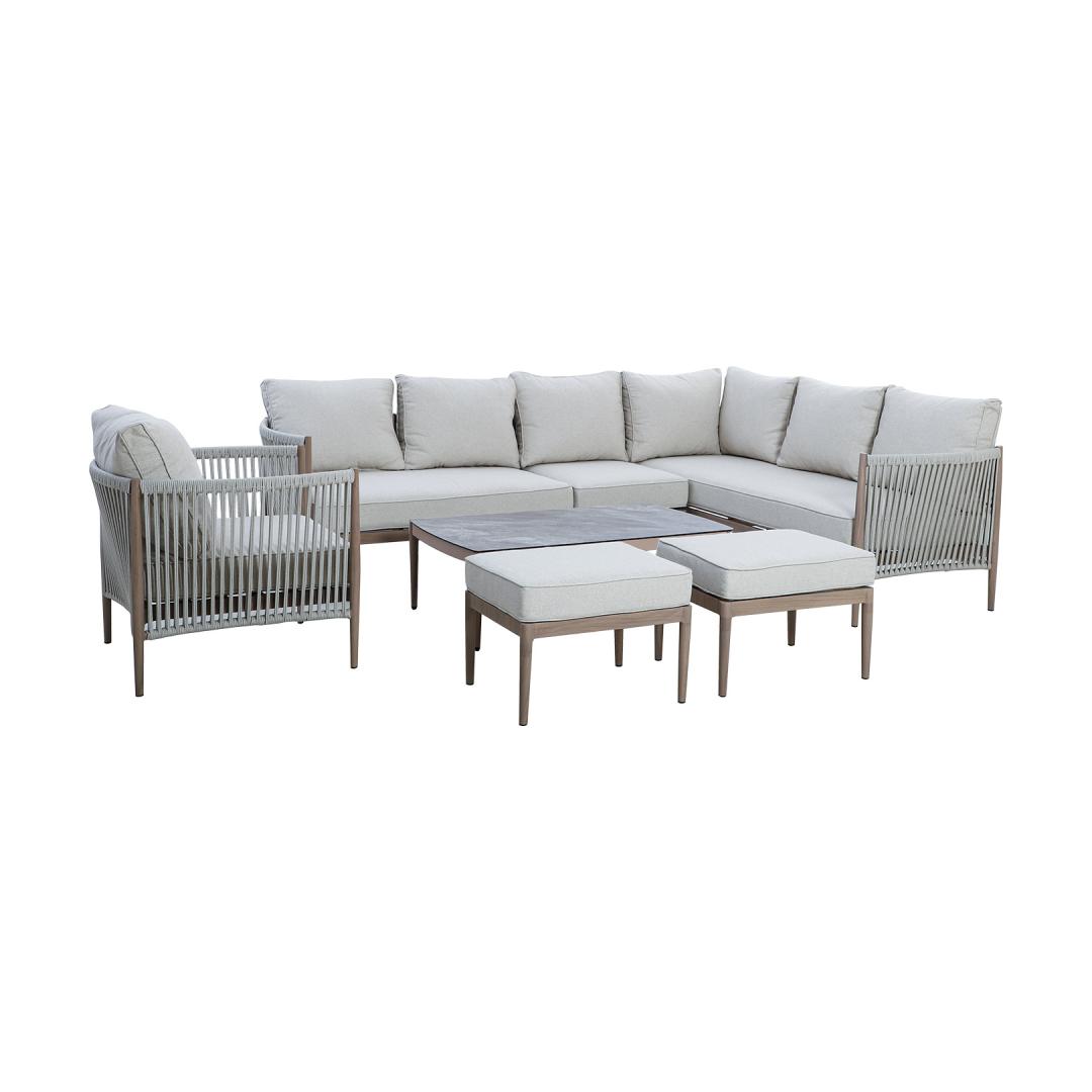 Aiamööblikomplekt MEDINA laud, nurgadiivan, tugitool ja 2 tumbat