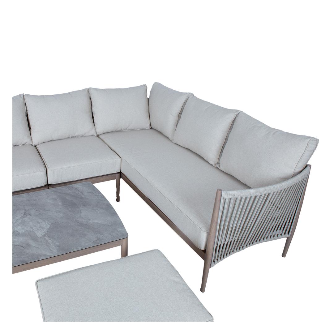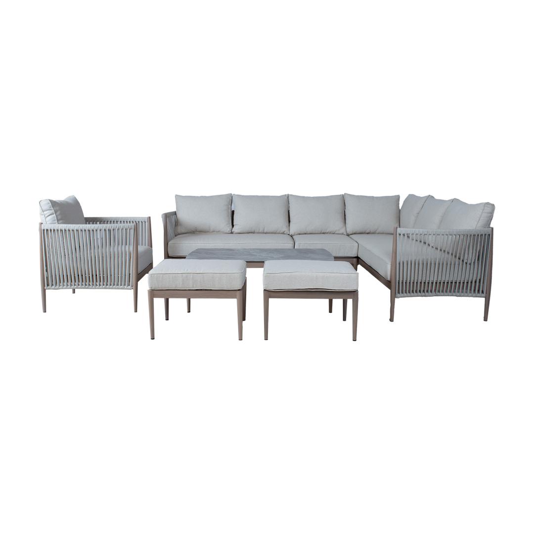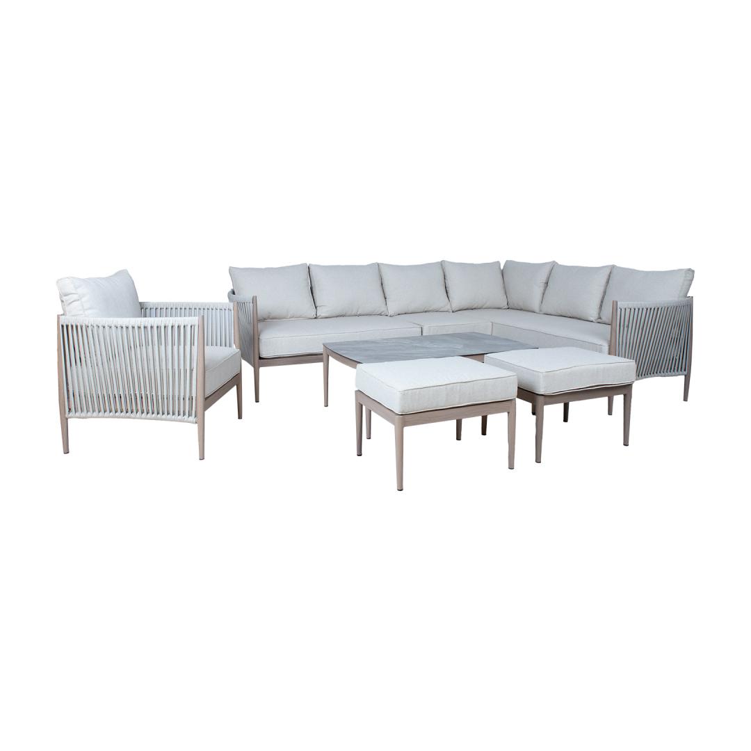 Aiamööblikomplekt MEDINA laud, nurgadiivan, tugitool ja 2 tumbat