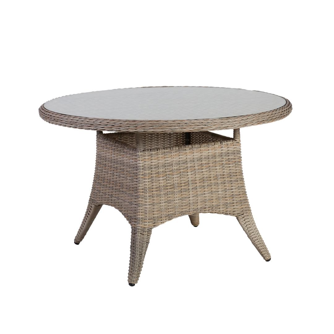 Aiamööblikomplekt PACIFIC 4-tooliga (10494). Laud D120xH75cm, alumiiniumraam plastikpunutisega, värvus: hallikasbeeþ. Lauaplaat: 5mm karastatud läbipaistev klaas. Tugitool PACIFIC 61,5x71,5xH91cm, alumiiniumraam plastikpunutisega, värvus: hallikasbeeþ. Padjad kuuluvad komplekti. Toode on ilmastikukindel.