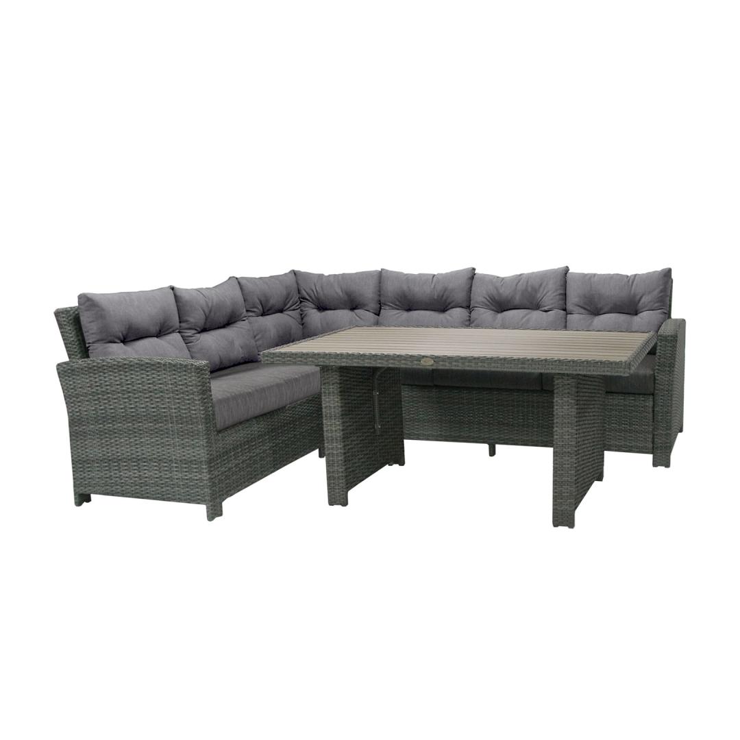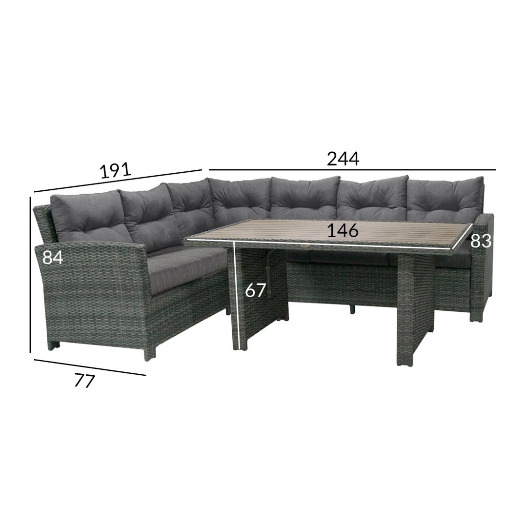 Aiamööblikomplekt PAVIA laud ja nurgadiivan, tumehall. Laua ja diivanite raamid on valmistatud alumiiniumist ja kaetud tumehalli plastikpunutisega. Laua mõõdud on 146x83xH67cm, lauaplaat: hallikaspruun harjatud kunstpuit. Diivan koosneb kahest osast: 3-kohaline diivan 191x77xH84cm, 2-kohaline diivan 166x77xH84cm. Istme kõrgus 47cm (koos padjaga), istme sügavus 48cm. Käetoe kõrgus maast 65cm. Komplekti kuulub 6 istmepatja ja 7 seljatoepatja. Patjade kattematerjal: hall polüesterkangas, täidis: plaatporoloon/kiudpolüester. Istmepatjade paksus 10cm, seljatoepatjade paksus 8cm. Toode on muutlikes ilmastikutingimustes hästi vastupidav ja lihtsalt hooldatav. Kaitset ilmastikuolude eest vajavad ainult padjad. Hea lahendus patjade igapäevaseks hoiustamiseks ja kuivana hoidmiseks on padjakast. Välitingimustes kasutatava mööbli eluea pikendamiseks soovitame kasutada välimööbli katteid. HOIUSTAMINE: suvehooaja lõppedes soovitame aiamööblit hoiustada siseruumides. Puhastage ja kuivatage mööbel enne hoiule panekut. Kasutage hoiustamiseks kuiva ning hea ventilatsiooniga ruumi.