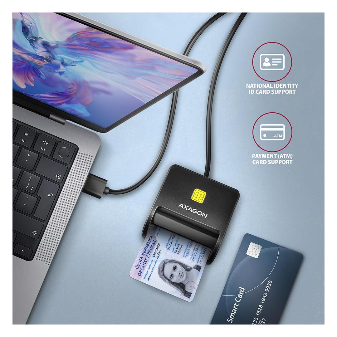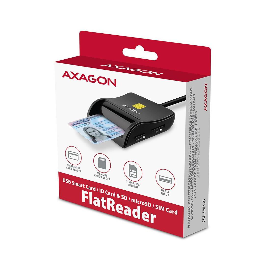 Axagon CRE-SM3SD USB Smart card & SD/microSD/SIM Flat. Interface: USB 2.0. Cable length: 1.3 m, Product colour: Black. Weight: 60 g