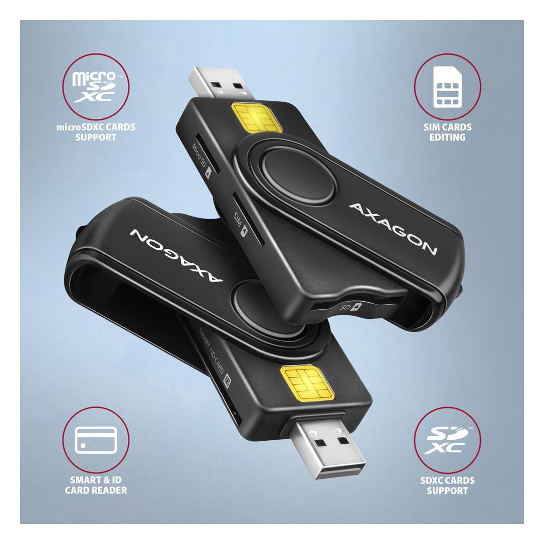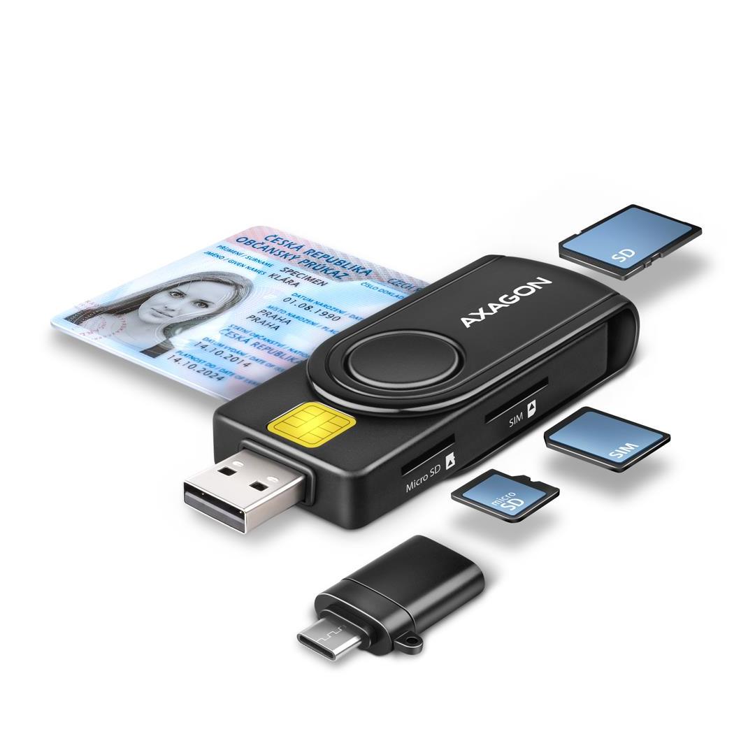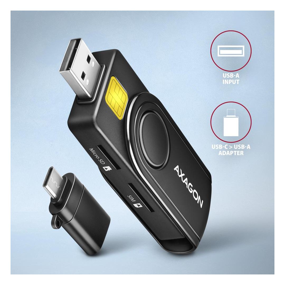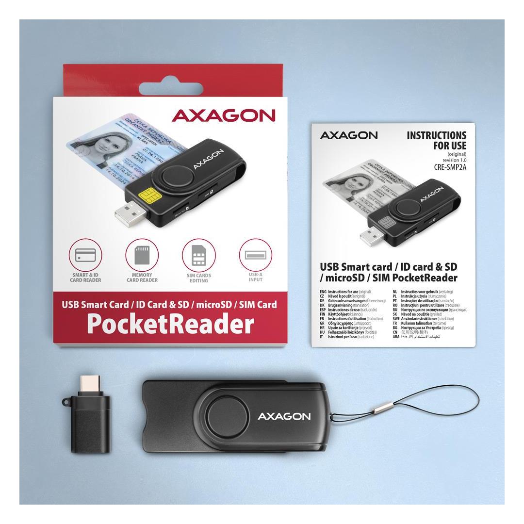 Axagon CRE-SMP2A USB Smart card & SD/microSD/SIM PocketReader. Interface: USB Type-A/USB Type-C. Product colour: Black. Weight: 20 g