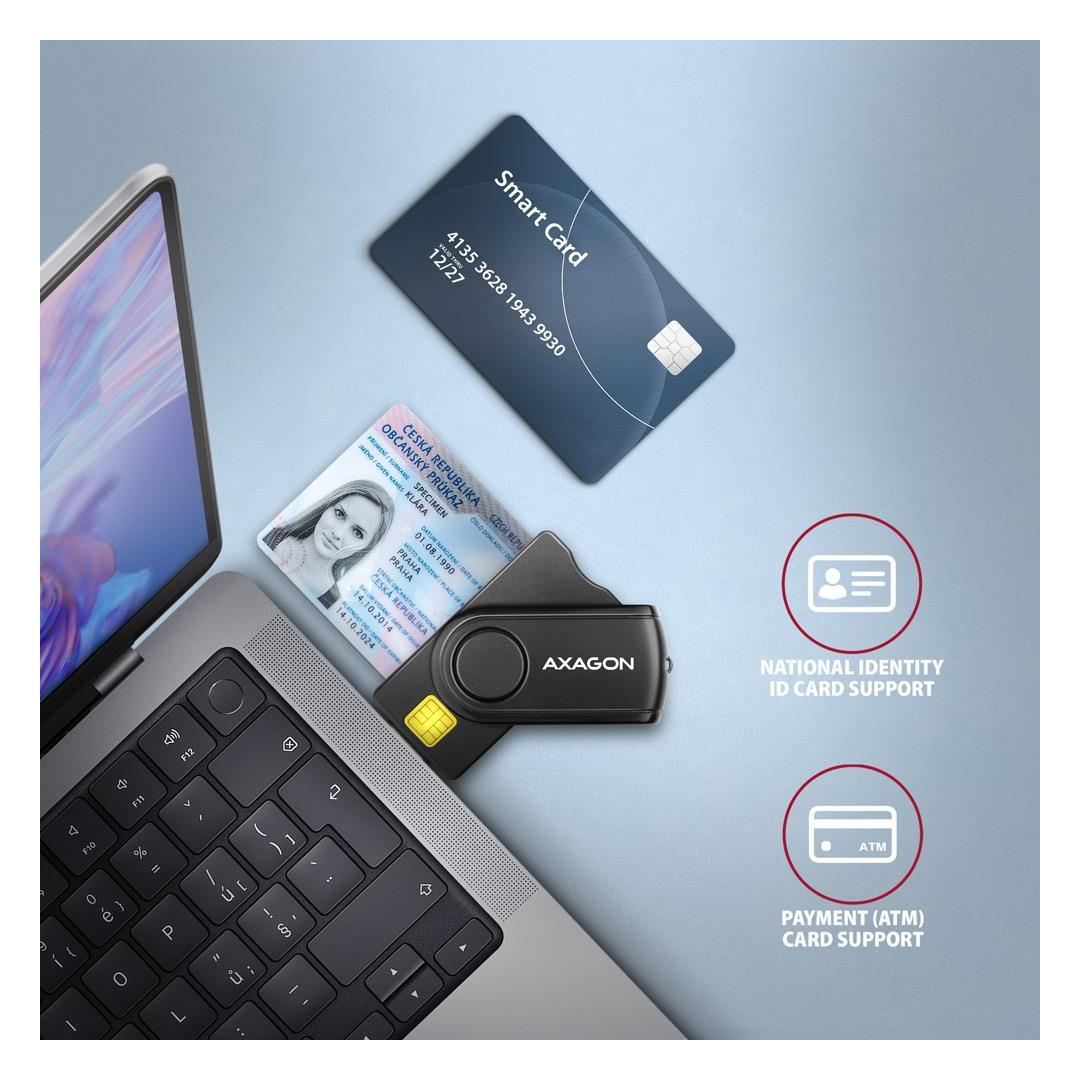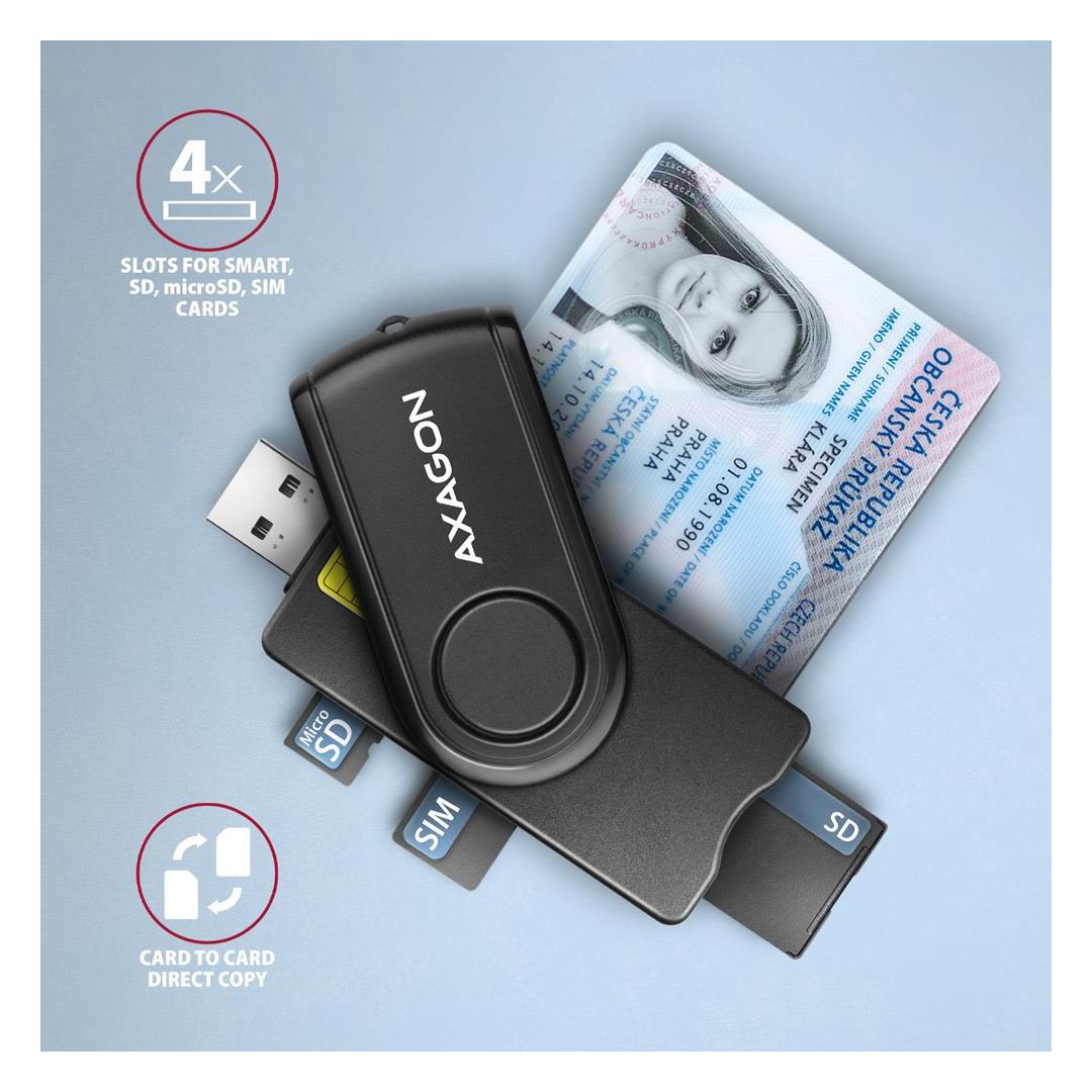 Compact travel desktop smart card / ID card reader AXAGON CRE-SMP2A PocketReader with USB 2.0 interface includes additional slots for SD, microSD and SIM cards. The card reader supports all common contact smart card formats, chip cards and other cards, including contact bank payment cards or contact electronic ID cards *. The reader is compatible with most national applications for eID (electronic ID cards).