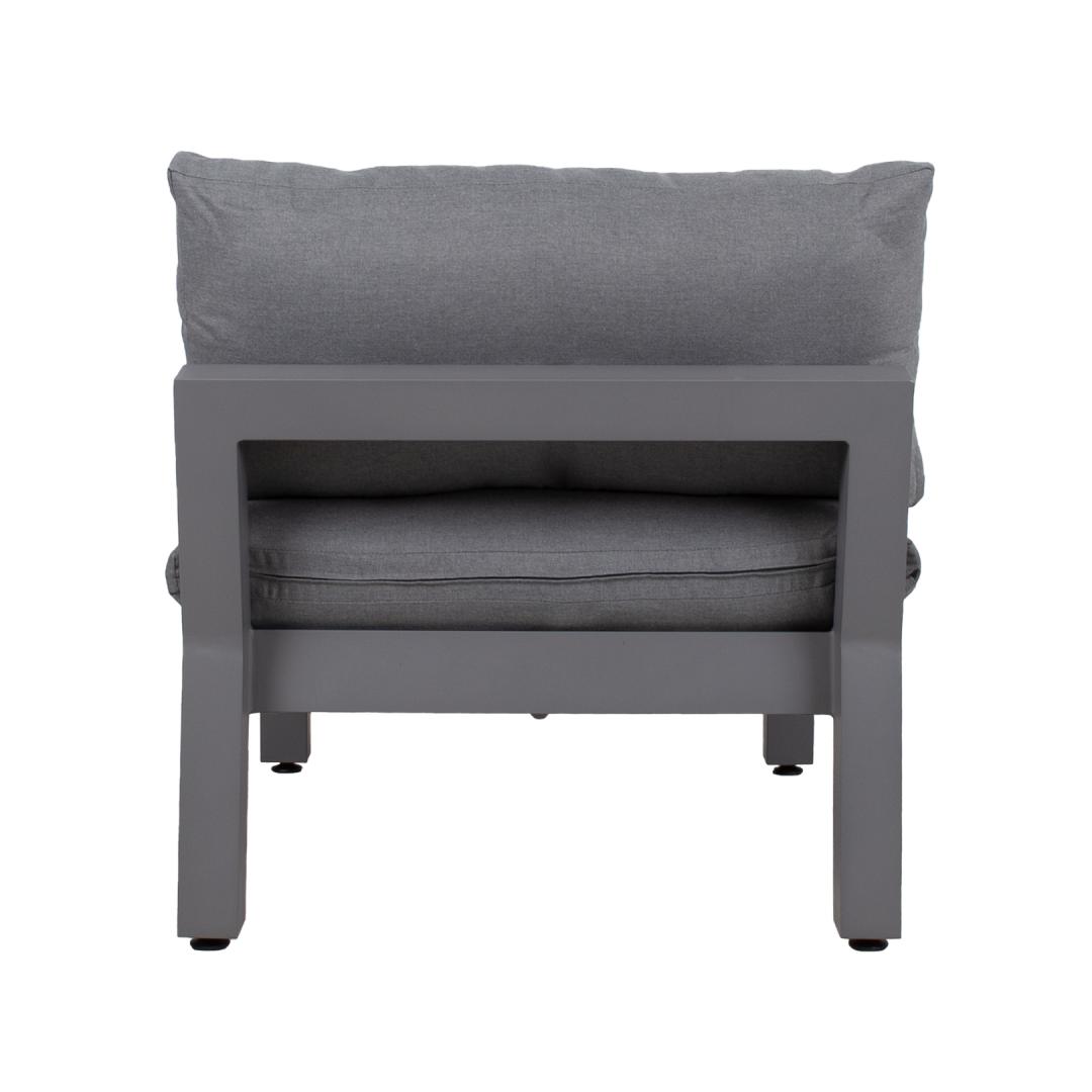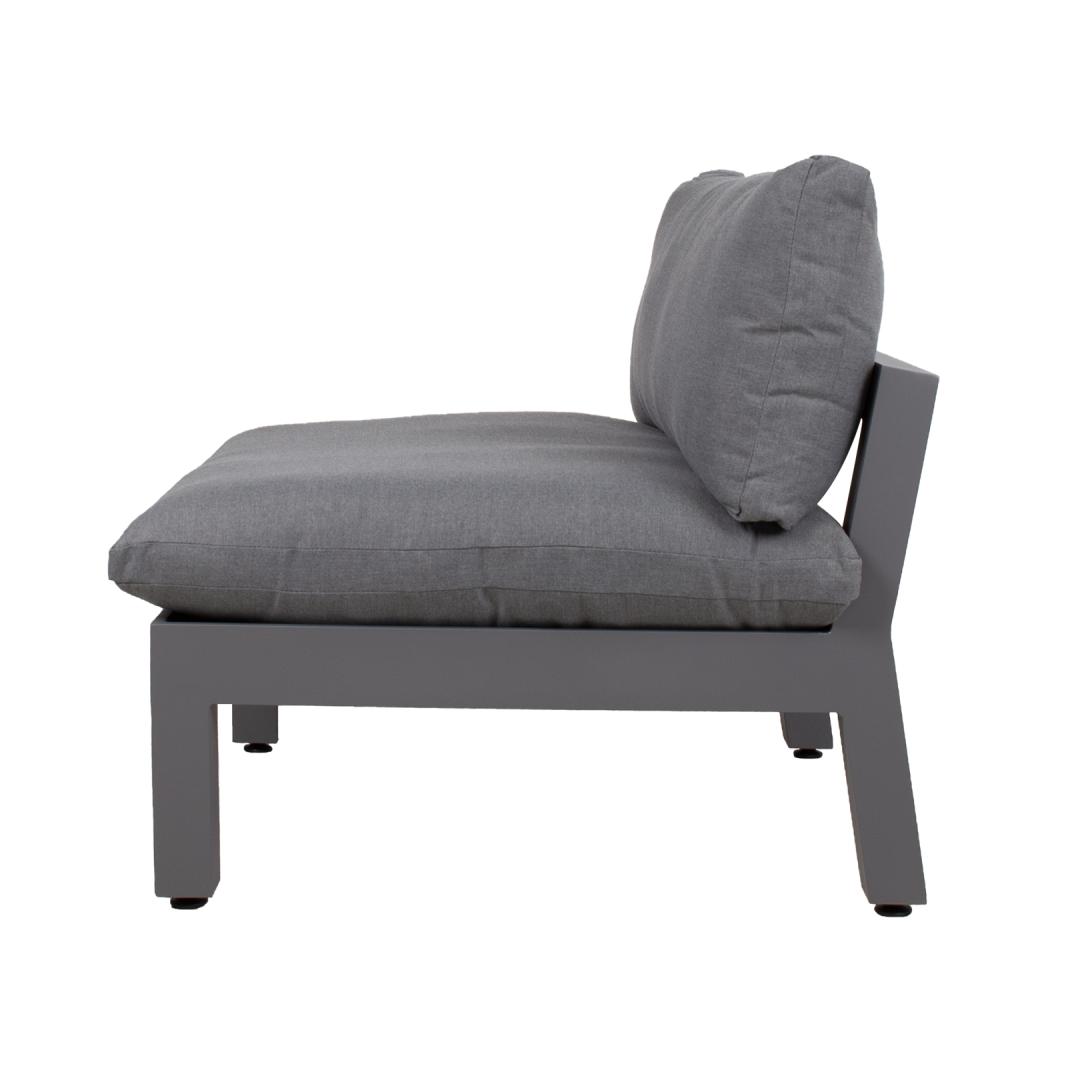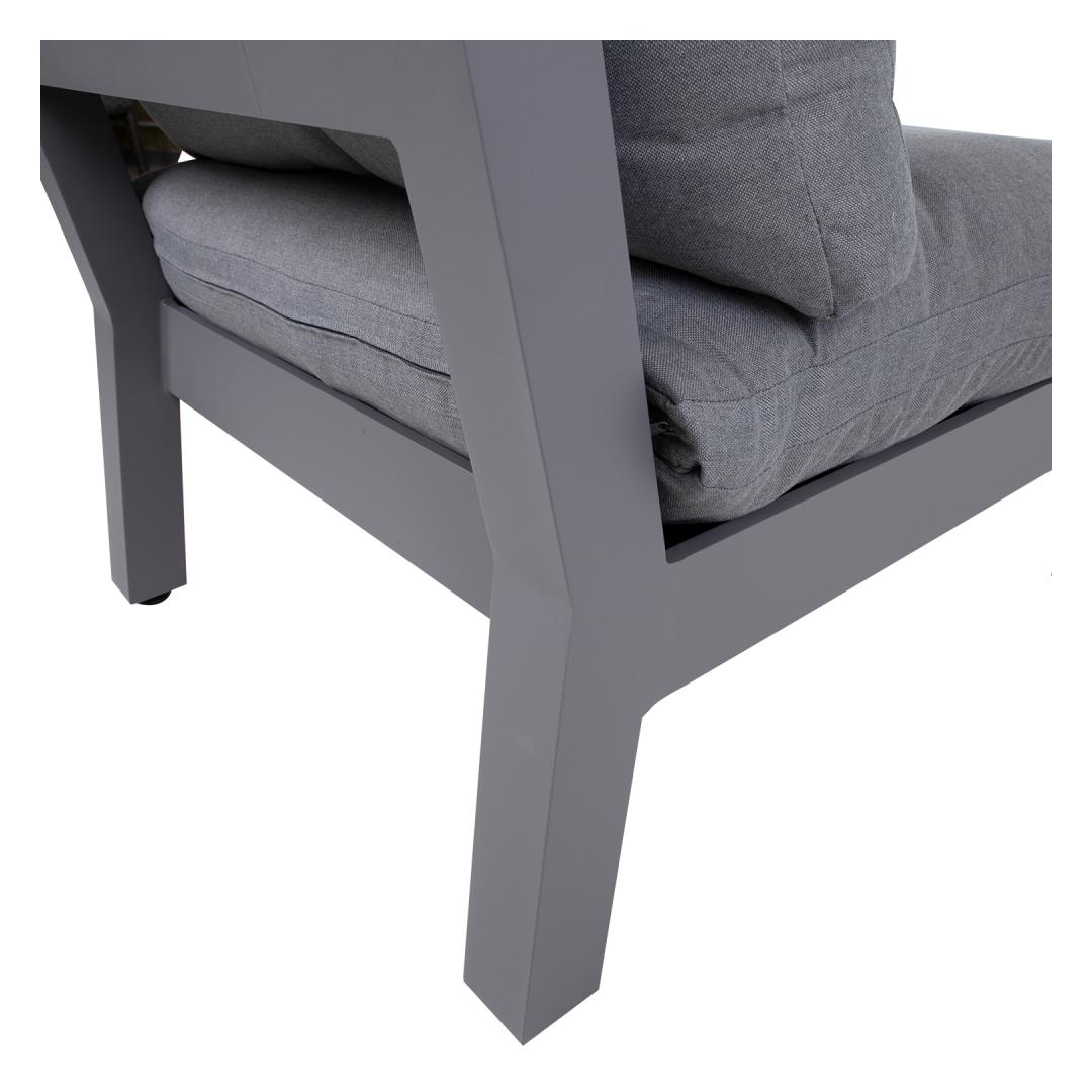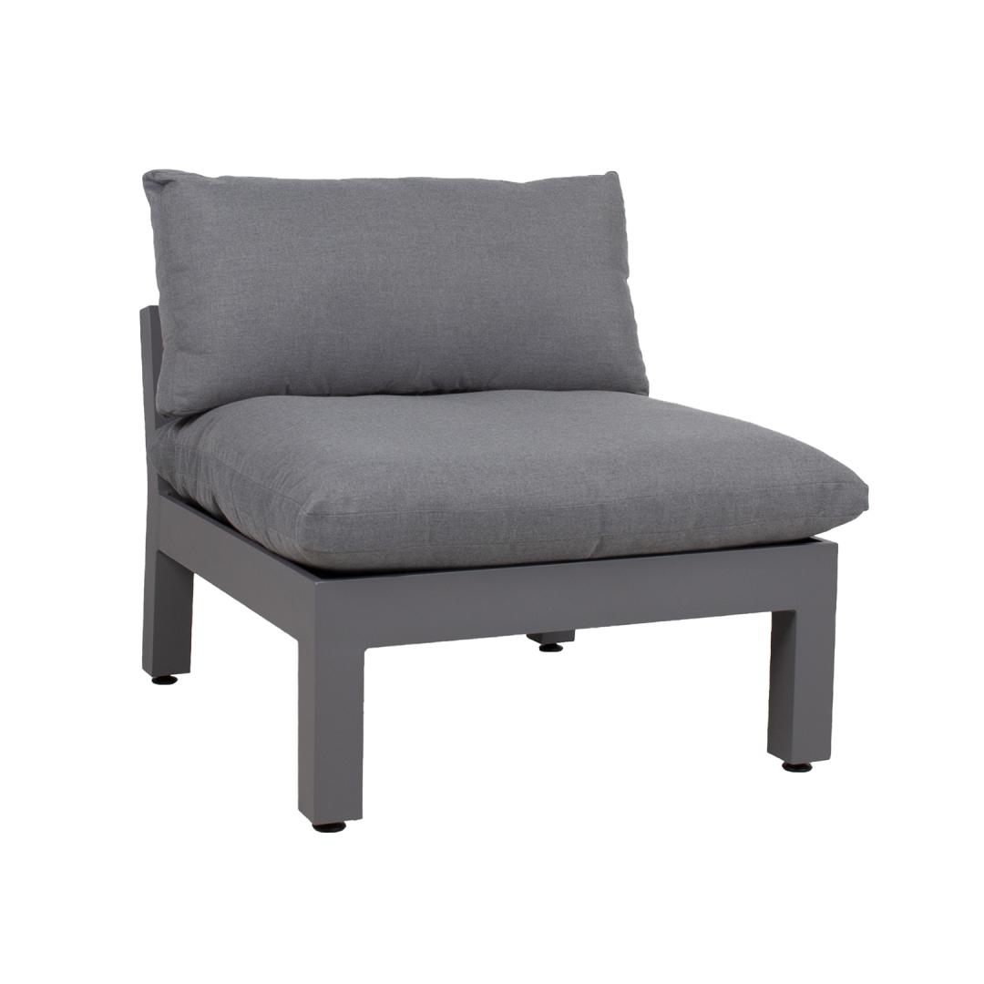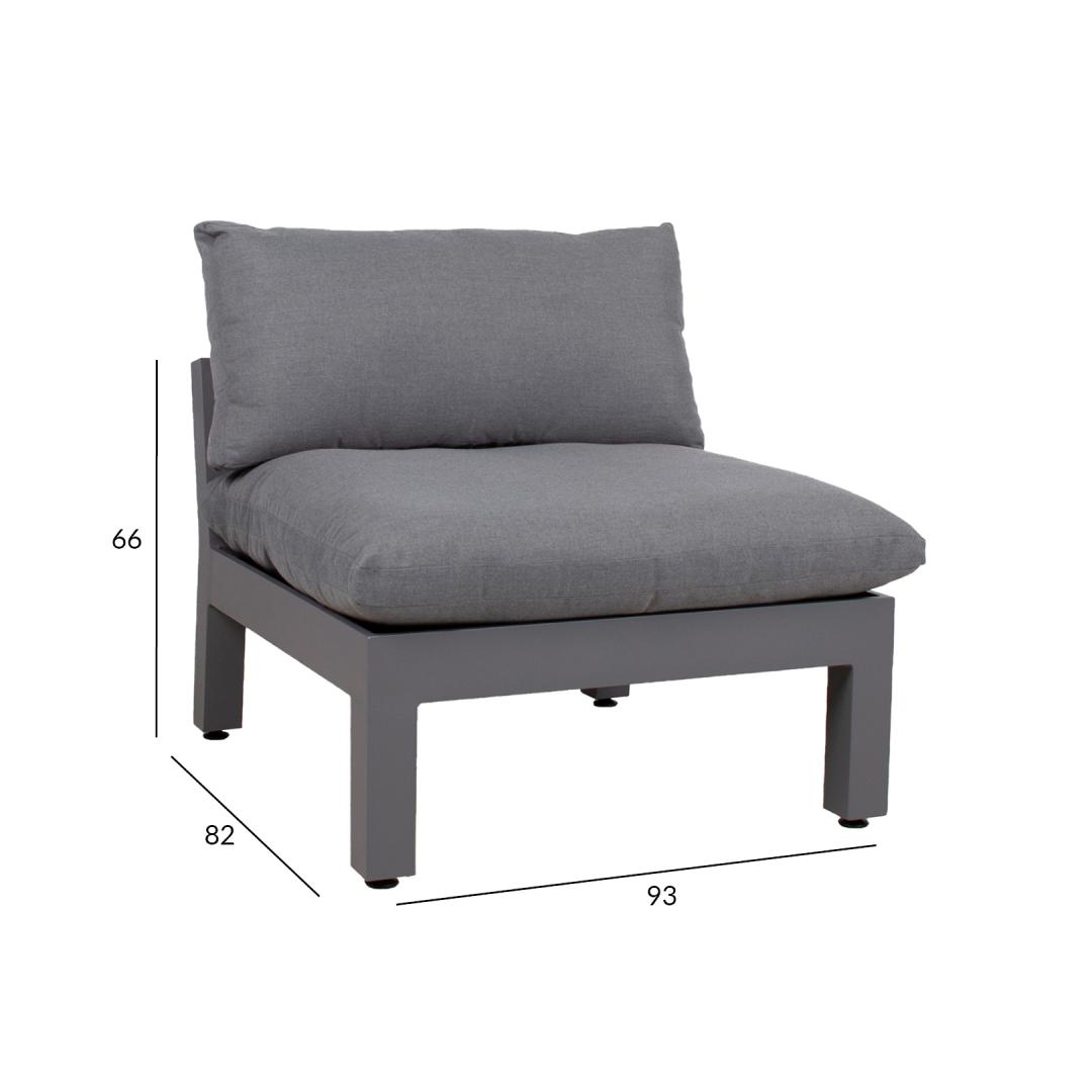 Diivani vahemoodul FLUFFY 82x93xH66cm, hall. Mooduldiivan on suurepärane võimalus luua sobiva kuju ja suurusega istumiskoht, mida on lihtne muuta ja ümber paigutada. Tooli raam on valmistatud alumiiniumist ja viimistletud halli pulbervärviga. Istmepõhjas on laiad põimitud rihmad, mida katab 3cm poroloonmatt. Paksud ja pehmed padjad ning elastne istmepõhi tagavad suurepärase istumismugavuse. Istme kõrgus raami ääreni on 35cm, koos padjaga 51cm. Istmepadja mõõdud on 87x87xH16cm, seljatoepadja mõõdud on 87x43x18cm. Padjakatted on valmistatud hallist polüesterkangast. Padjakatted on eemaldatavad ja pestavad. Toode on muutlikes ilmastikutingimustes hästi vastupidav ja lihtsalt hooldatav. Kaitset ilmastikuolude eest vajavad ainult padjad. Hea lahendus patjade igapäevaseks hoiustamiseks ja kuivana hoidmiseks on padjakast. Välitingimustes kasutatava mööbli eluea pikendamiseks soovitame kasutada välimööbli katteid. HOIUSTAMINE: suvehooaja lõppedes soovitame aiamööblit hoiustada siseruumides. Puhastage ja kuivatage mööbel enne hoiule panekut. Kasutage hoiustamiseks kuiva ning hea ventilatsiooniga ruumi.