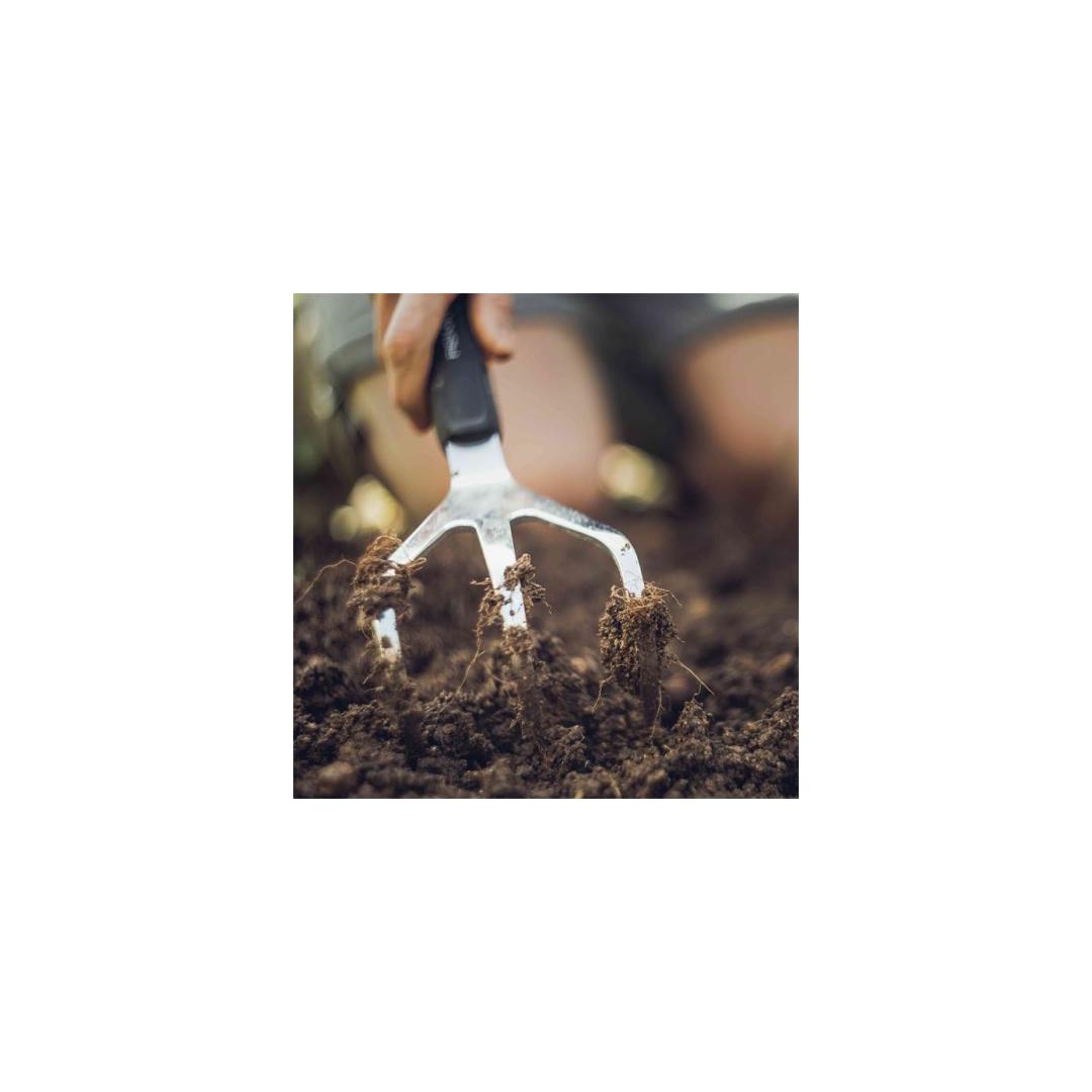 Functional Xact cultivator for loosening soil, removing weeds and aerating the soil. Long and sharp stainless steel tines provide maximum soil contact to speed work. Comfortable handle design with SoftGrip™ allows multiple handle positions during use, and long handle brings perfect balance and extra power when needed.