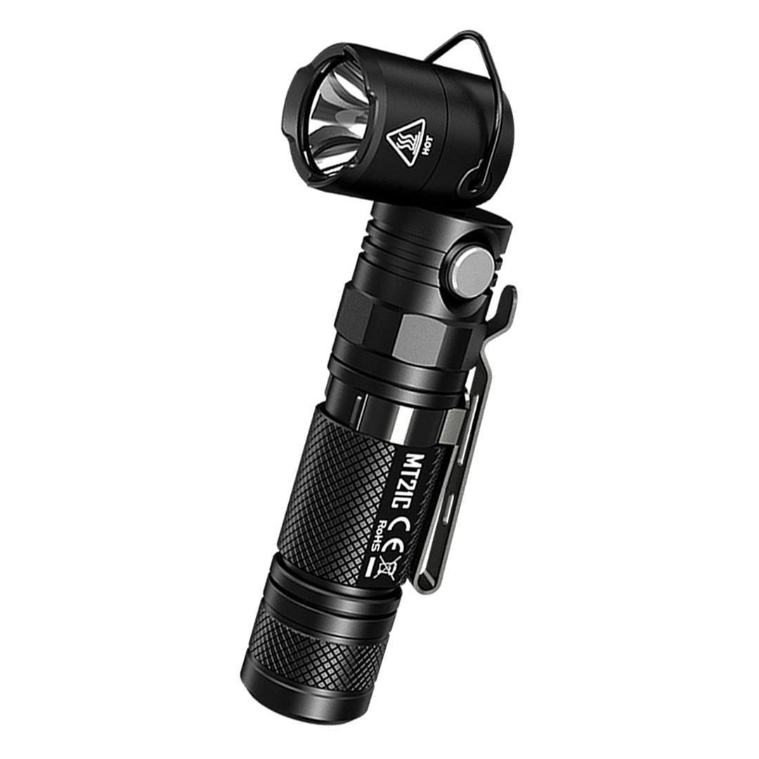 The NITECORE MT21C compact multi-functional flashlight uses an innovative 90 degree tiltable head, giving you the unique ability to use the light as a streamlined everyday carry torch or a versatile angled work light. Equipped with a powerful CREE XP-L HD V6 LED capable of 1000 lumens and 201 yards of throw, making it a great choice for professional and recreational uses alike. A single side switch controls five brightness levels and three special modes, allowing you to easily select any brightness level like turbo mode for long distance searching, to ultralow mode for map reading, and three special modes (strobe, SOS, and beacon) for emergency situations like alerting others during roadside hazards or signaling first responders--all without fumbling with multiple buttons! Powered by one 18650 or two CR123A batteries, the MT21C has a max runtime of up to 700 hours and can easily handle extended work shifts. The compact size and lightweight body of the MT21C won't weigh you down and allows it to easily be carried in pockets, bags and backpacks, making it an ideal light for EDC and traveling. The MT21C also includes a magnetic tail cap, holster, pocket clip and lanyard, giving it multiple mounting options for hands-free use and making it an ideal light for any task.