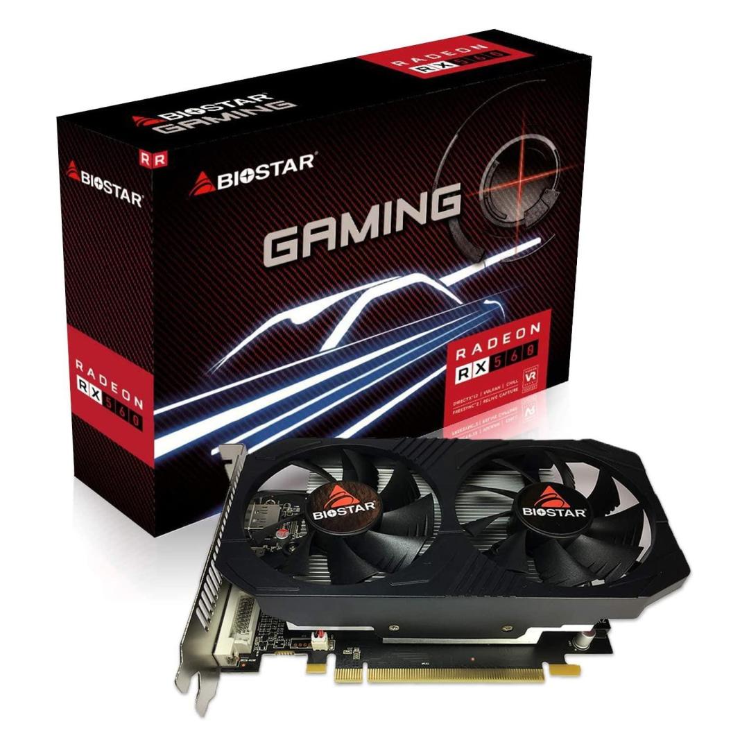 Biostar Radeon RX560. Graphics processor family: AMD, Graphics processor: Radeon RX 560, Processor frequency: 1175 MHz. Discrete graphics card memory: 4 GB, Graphics card memory type: GDDR5, Memory bus: 128 bit. Maximum resolution: 7680 x 4320 pixels. DirectX version: 12.0. Interface type: PCI Express 3.0. Cooling type: Active, Number of fans: 2 fan(s)