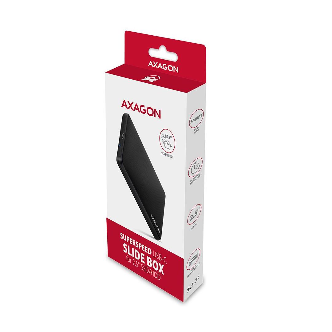 Lightweight screwless external box AXAGON EE25-SLC SLIDE BOX with USB 3.2 Gen 1 (USB 3.0) and SATA 6G inter-face is designed for all 2.5" SATA hard drives or SSDs. A double-sided USB-C connector provides a reliable and con-venient connection.