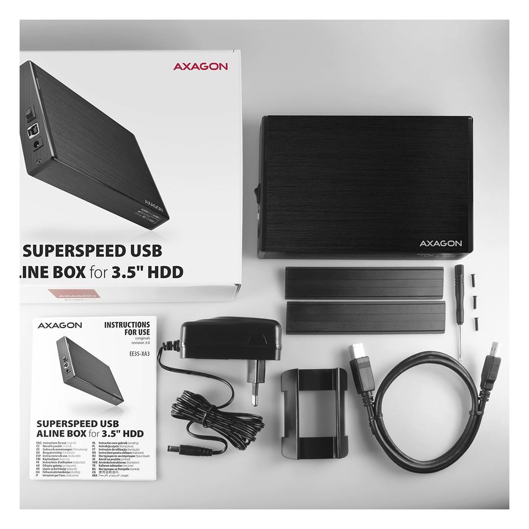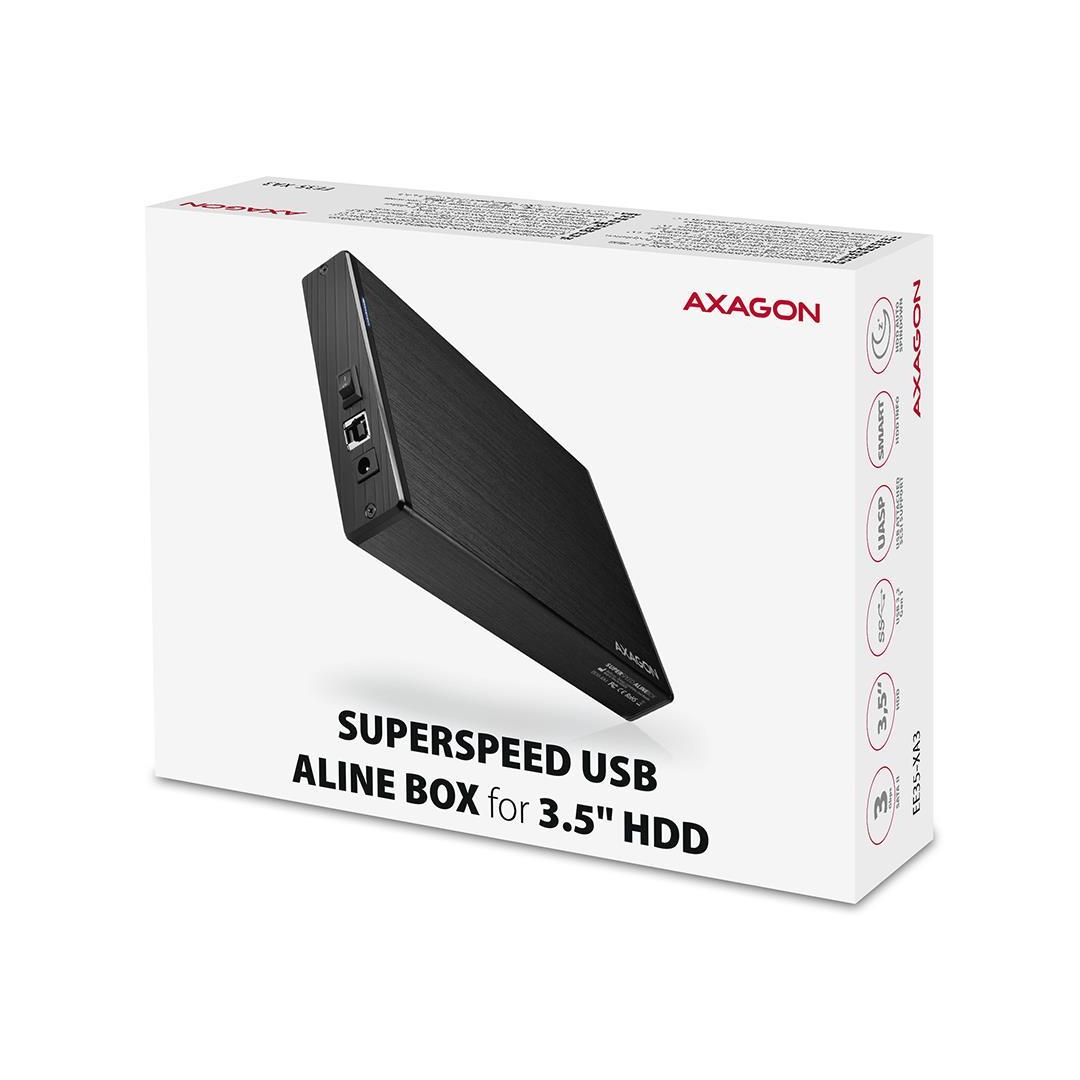 The compact aluminum AXAGON EE35-XA3 ALINE external box with a high-speed USB 3.2 Gen 1 (USB 3.0) interface intended for 3.5" SATA disks.