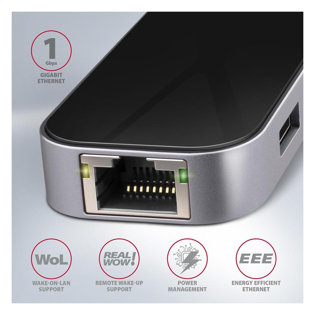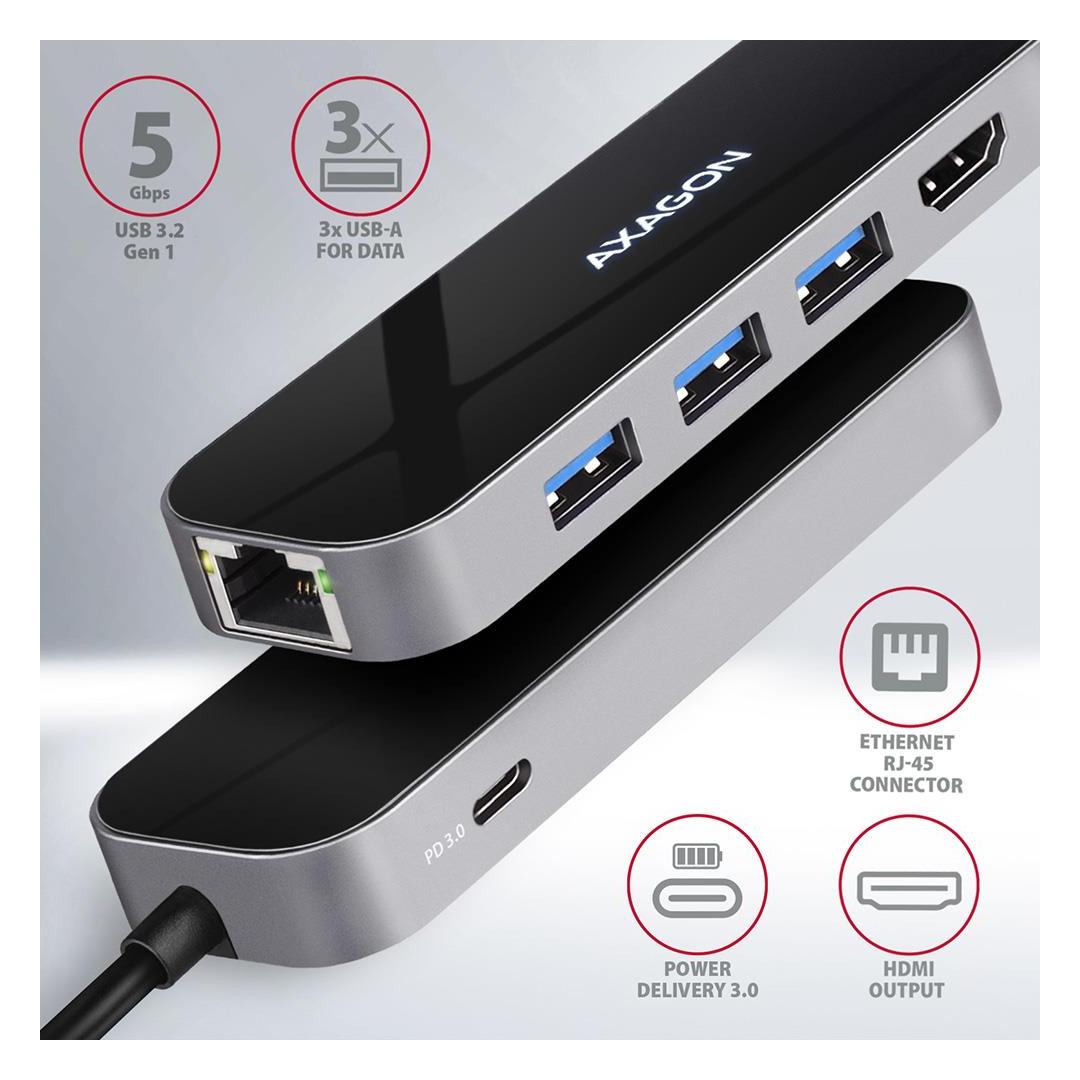Multiport USB-C 3.2 Gen 1 hub AXAGON HMC-6GL expands your laptop, computer or phone with six ports. You can easily and quickly connect up to three USB devices, Gigabit Ethernet network and HDMI display to your computer at the same time via the doublesided USB-C connector. You also get the possibility to supply laptop using Power Delivery technology at the same time. The USB-C hub will provide you with a simple and compact 6in1 docking station for notebook like MacBook Pro.