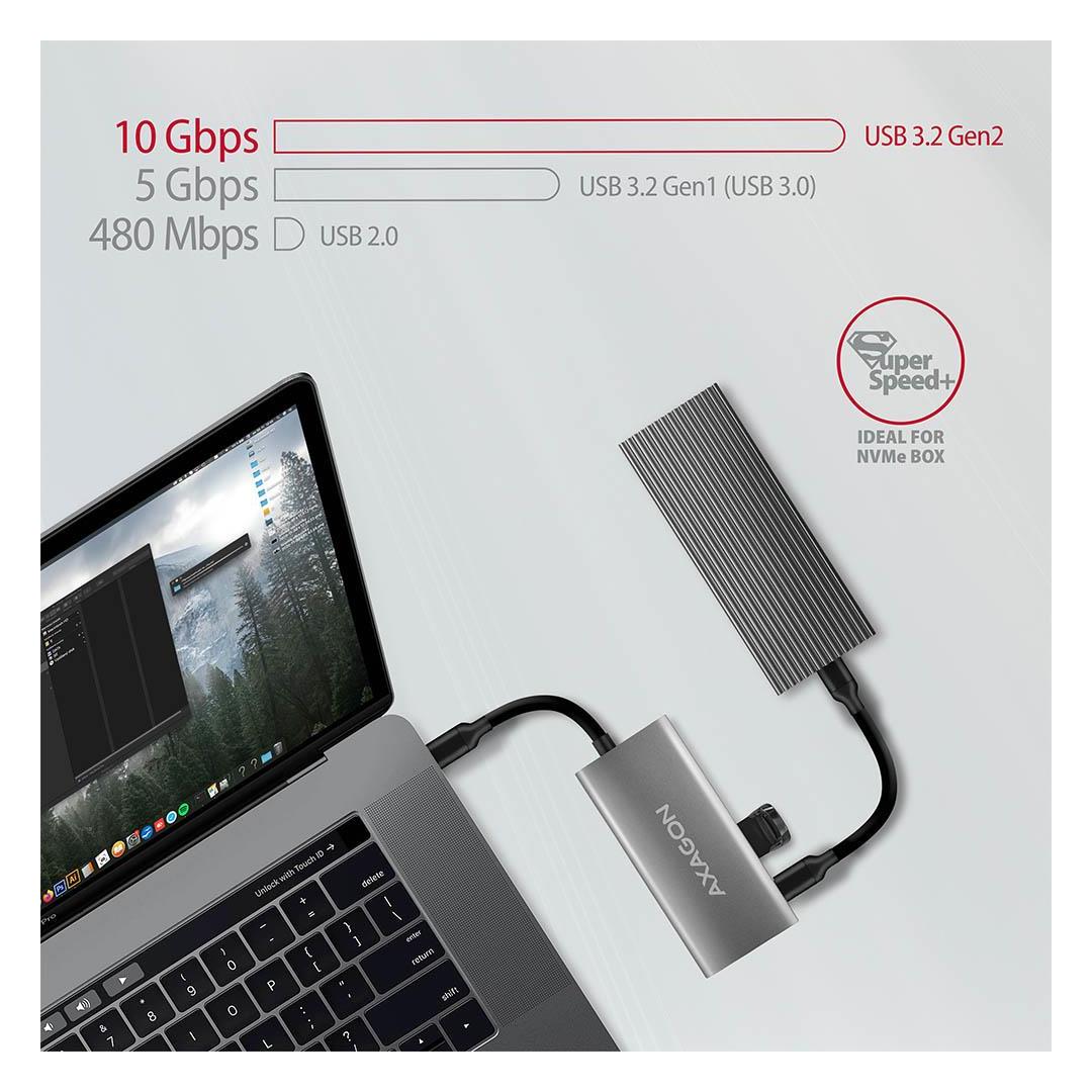 Thanks to the advanced USB 3.2 Gen 2 interface, you can connect high-speed devices such as NVMe M.2 external drives to all outputs at up to 2x higher speed 10 Gb/s compared to standard Generation 1 hubs with a speed of only 5 Gb/s. The hub can handle permanent connection of several external drives simultaneously and USB-C ports allow charging of phones and tablets with a current of up to 3A.