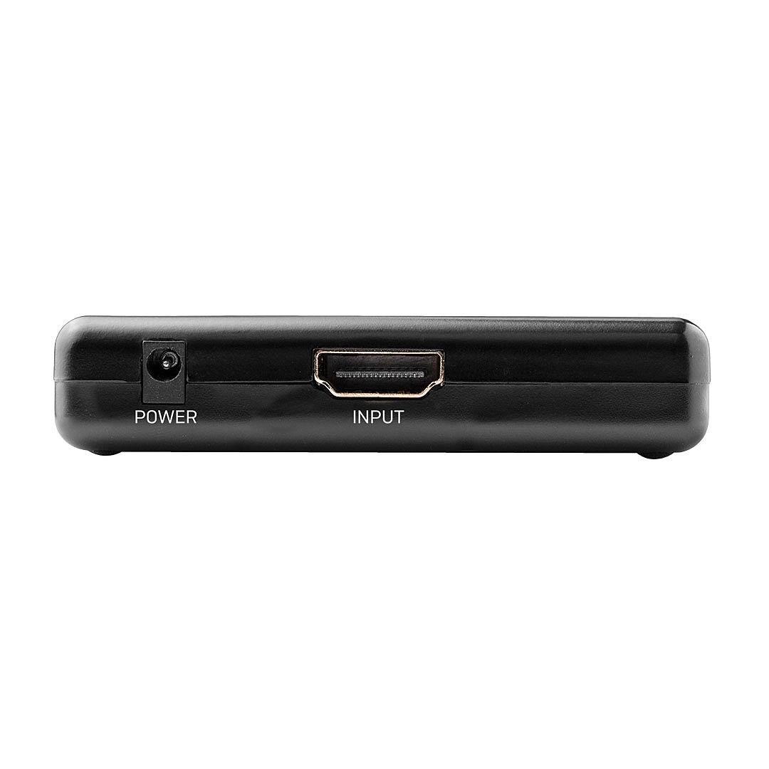 Compact 2-way splitter for connecting one HDMI source device to two HDMI displays or projectors.