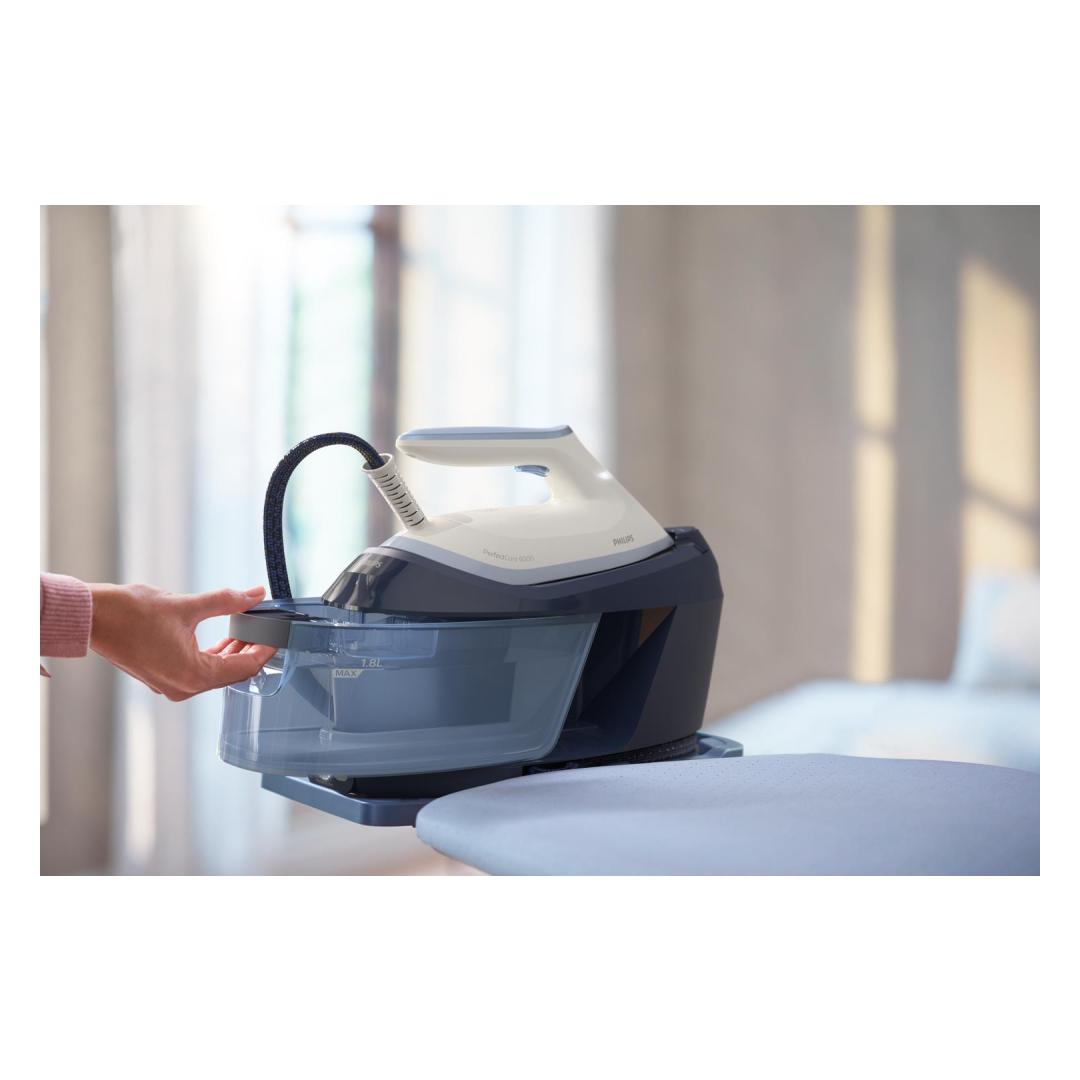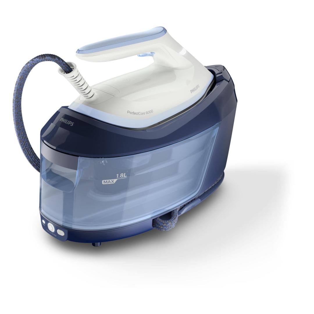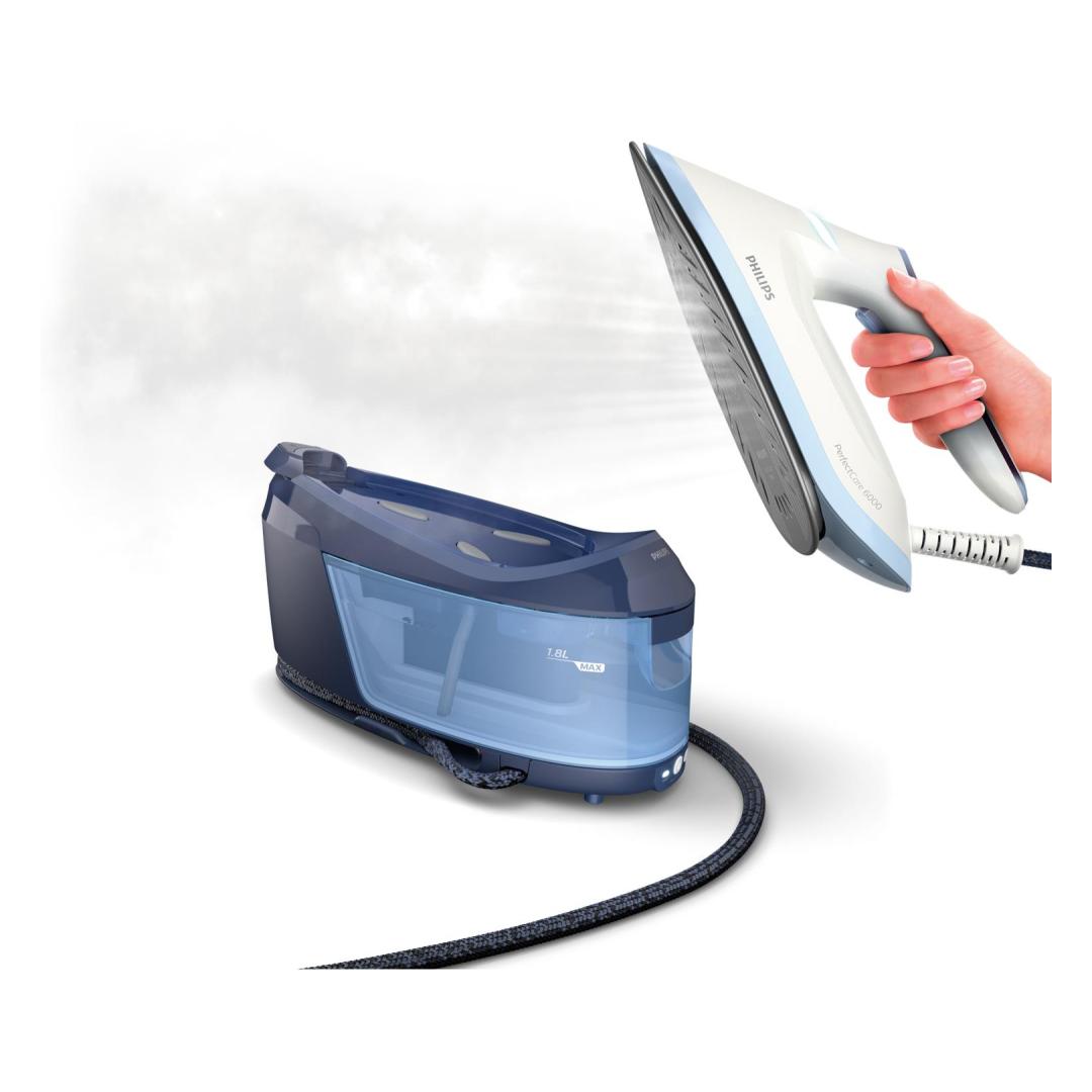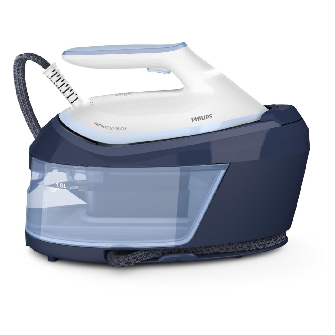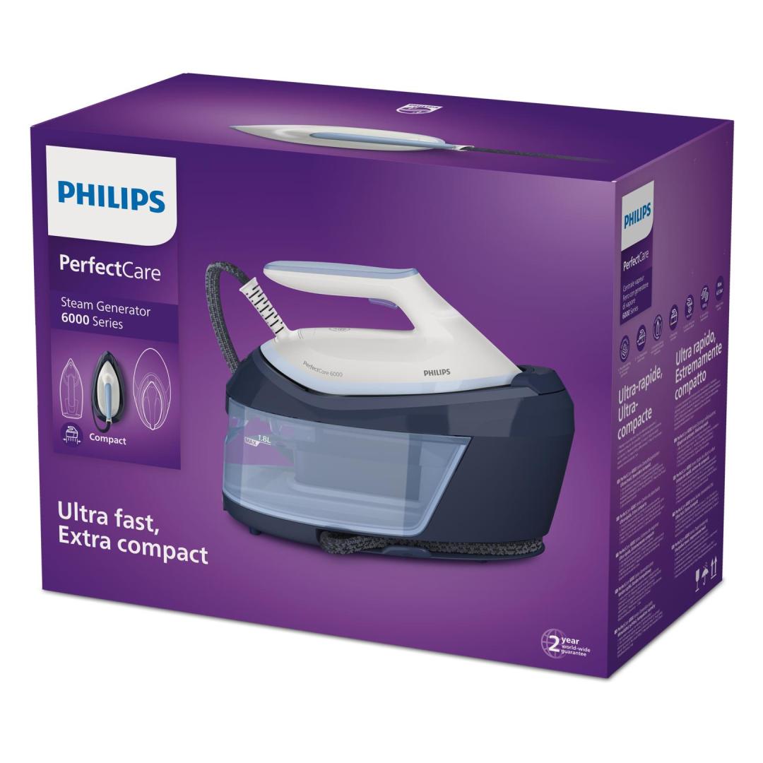 Philips 6000 series PerfectCare PSG6026/20 Steam Generator. Iron power: 2400 W, Steam boost performance: 500 g/min, Soleplate type: SteamGlide Plus soleplate. AC input voltage: 220 - 240 V, Energy saving percentage: 30%. Cord length: 1.65 m, Hose length: 1.6 m, Cord fastening system: Velcro fix. Width: 168 mm, Depth: 368 mm, Height: 269 mm. Maximum power: 2400 W, Warranty period: 2 year(s), Country of origin: United Kingdom