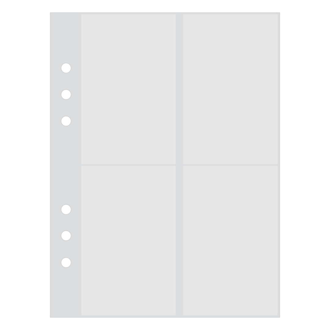 6 auguga visiitkaarditaskud Manager-tüüpi kaantele. Aukude kaugused tsentrist tsentrisse 19-19-70-19-19 mm. Lk. mõõt 147x205mm. Komplektis 5 lehte. Igal lehel 4 taskut.