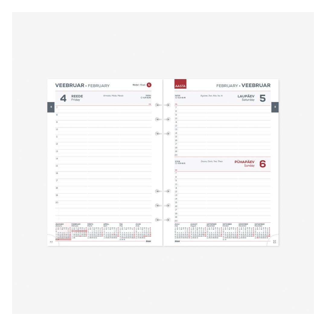 Sisumõõt: 145 x 210 mm (A5) Keel: eesti ja inglise Augustatud lahtised lehed (6 auku) Perforeeritud lehenurgad Sobib järgnevatele kaantele: MAXI Nahk MAXI Kunstnahk MAXI Exclusive