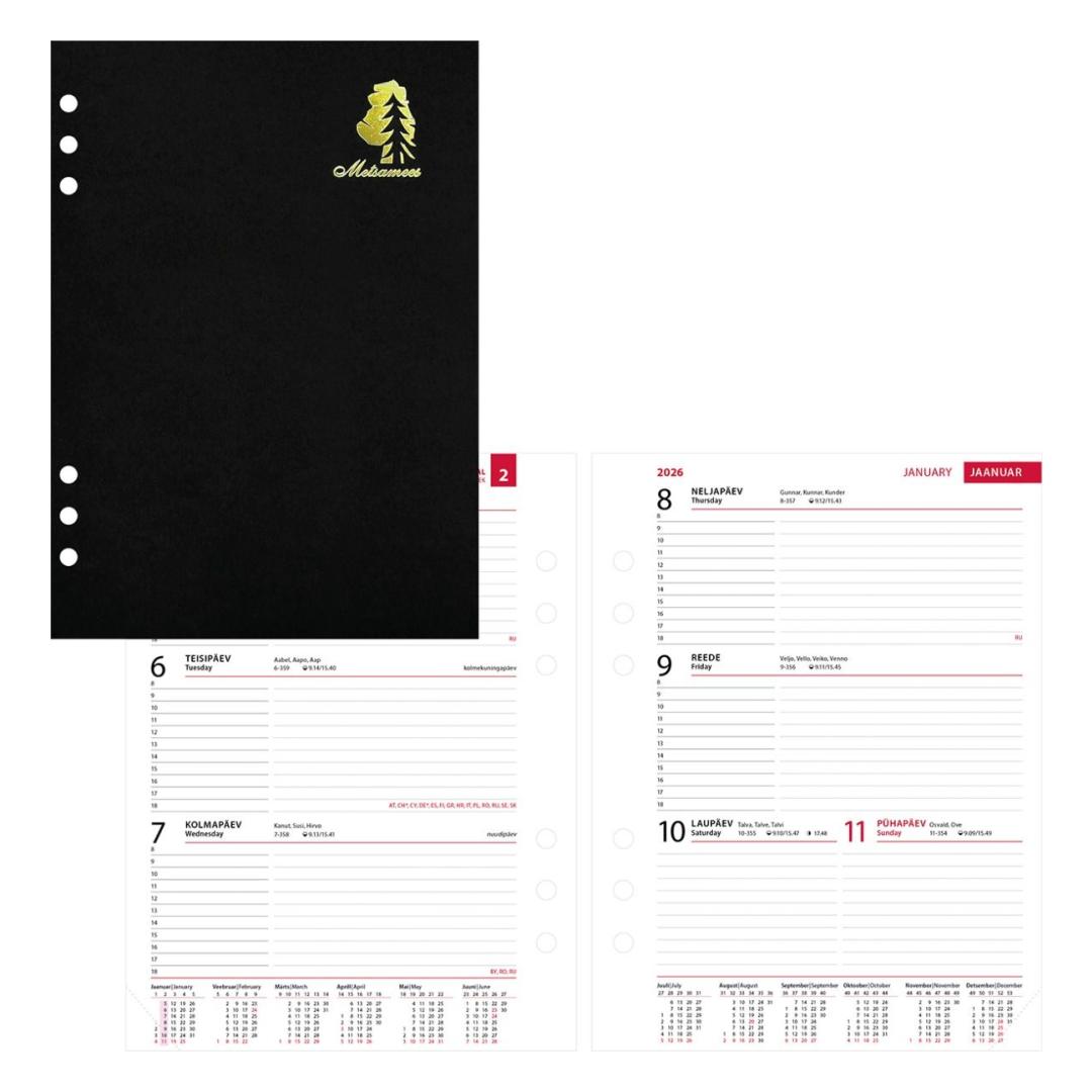 6 auguga kalendrisisu Manager-tüüpi metsamehe kalendrile. Nädala- ja horisontaaljaotus. Aukude kaugused tsentrist tsentrisse 19-19-70-19-19 mm. Lk. mõõt 142x202 mm. Kalendaarium sisaldab riigipühi, riiklikke ja rahvakalendri tähtpäevi, lipupäevi, nimepäevi, 42 riigi pühi lühenditena, päikese tõusu ja loojangu aegu, kuu faase, aastaaegade alguseid, käesoleva ja järgneva aasta plaane, aasta tabelkalendreid, foneetilisi tähestikke, mõõtühikute teisendamise tabelit ja tabeleid enamuse maailma riikide telefoni koodide, valuuta, ajavahe jne kohta. Lisad: kalastuskalender, jahikalender, metsakahjurputukate kalender, kasvava metsa mahutabel, ümarpuidu mahutabel, laudade ja prusside mahutabel.