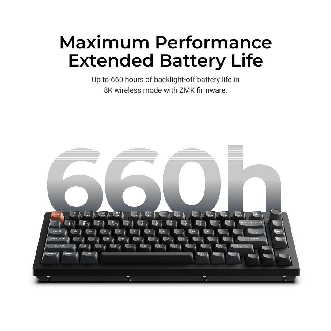 Meet the Keychron V1 Ultra 8K, a next-generation 75% wireless custom mechanical keyboard engineered for unparalleled performance. It supports 2.4 GHz wireless, Bluetooth 5.3, and wired connections. Powered by ZMK firmware, it enables an 8K polling rate in wireless mode while delivering up to 660 hours of battery life. Enhanced with multiple layers of acoustic foam and Keychron Launcher, it offers a refined typing experience with premium sound and complete customization.