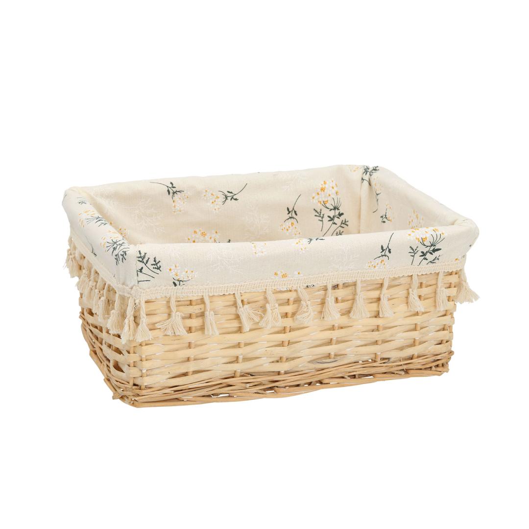 Tekstiilvooder: puuvillane lilleline kangas. Korvi materjal: käsitsi punutud naturaalne pajuvits.