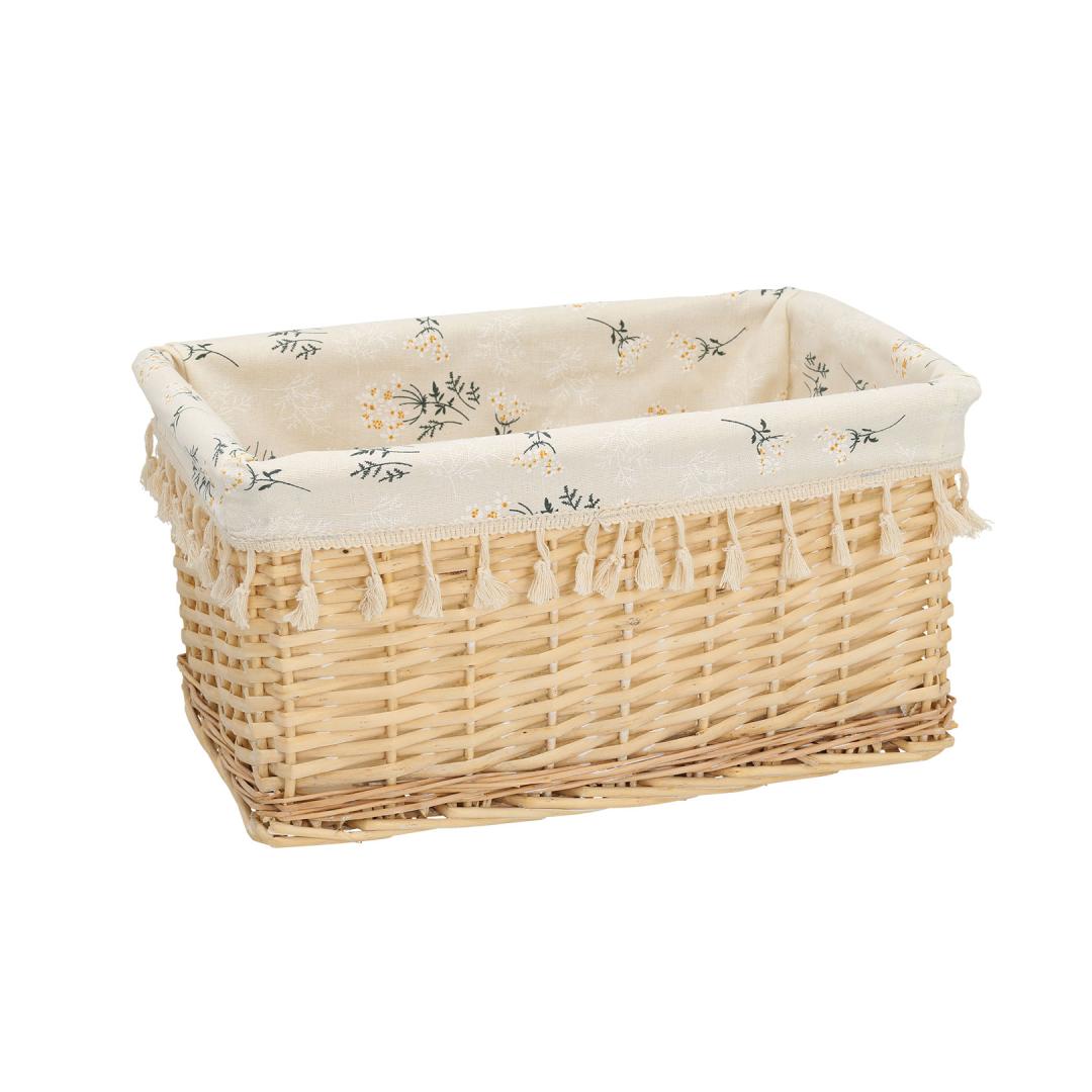 Tekstiilvooder: puuvillane lilleline kangas. Korvi materjal: käsitsi punutud naturaalne pajuvits.