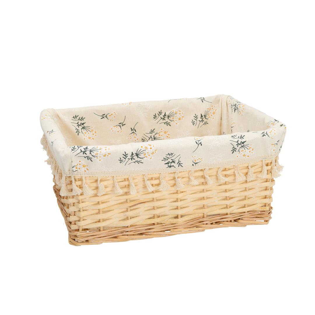 Tekstiilvooder: puuvillane lilleline kangas. Korvi materjal: käsitsi punutud naturaalne pajuvits.