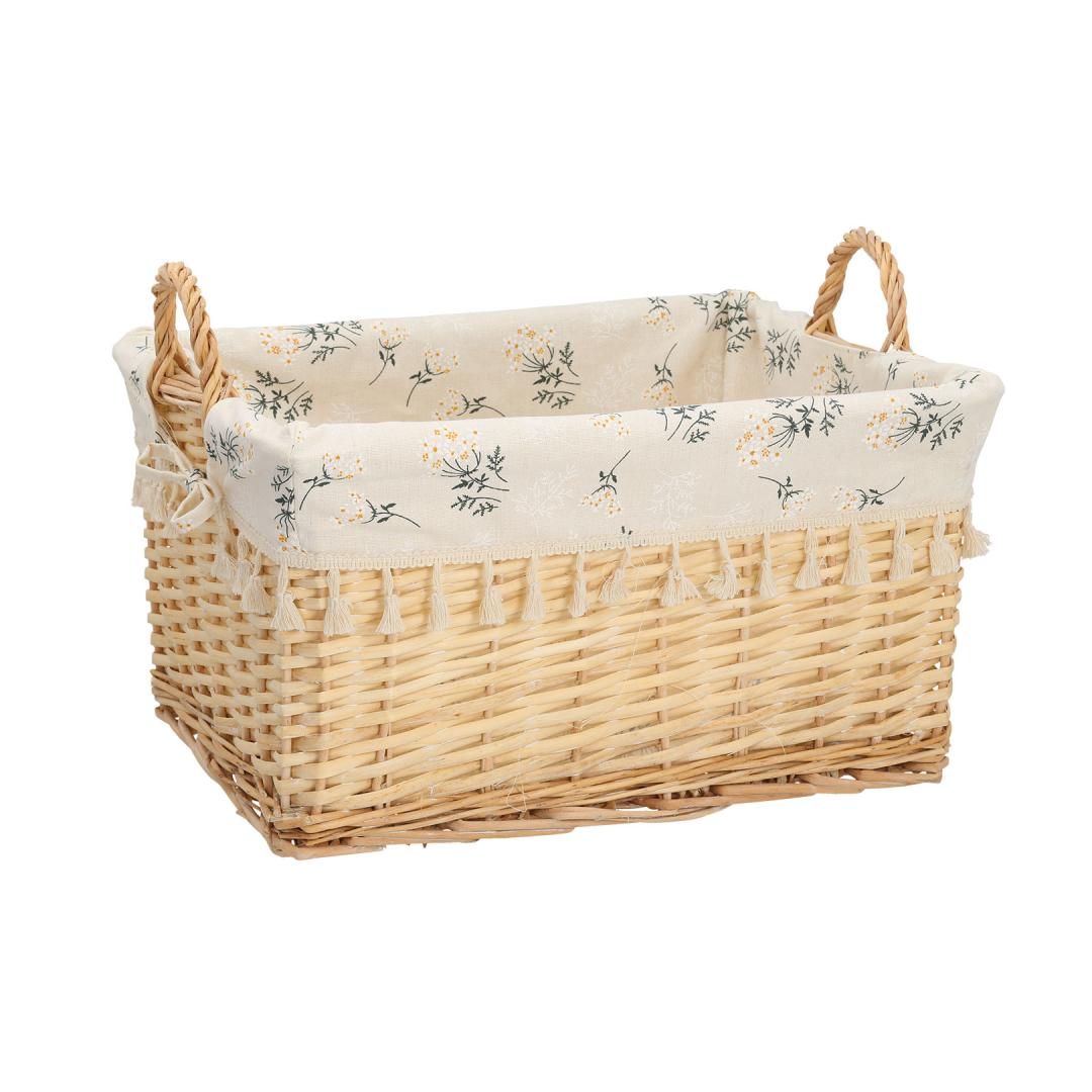 Tekstiilvooder: puuvillane lilleline kangas. Korvi materjal: käsitsi punutud naturaalne pajuvits.