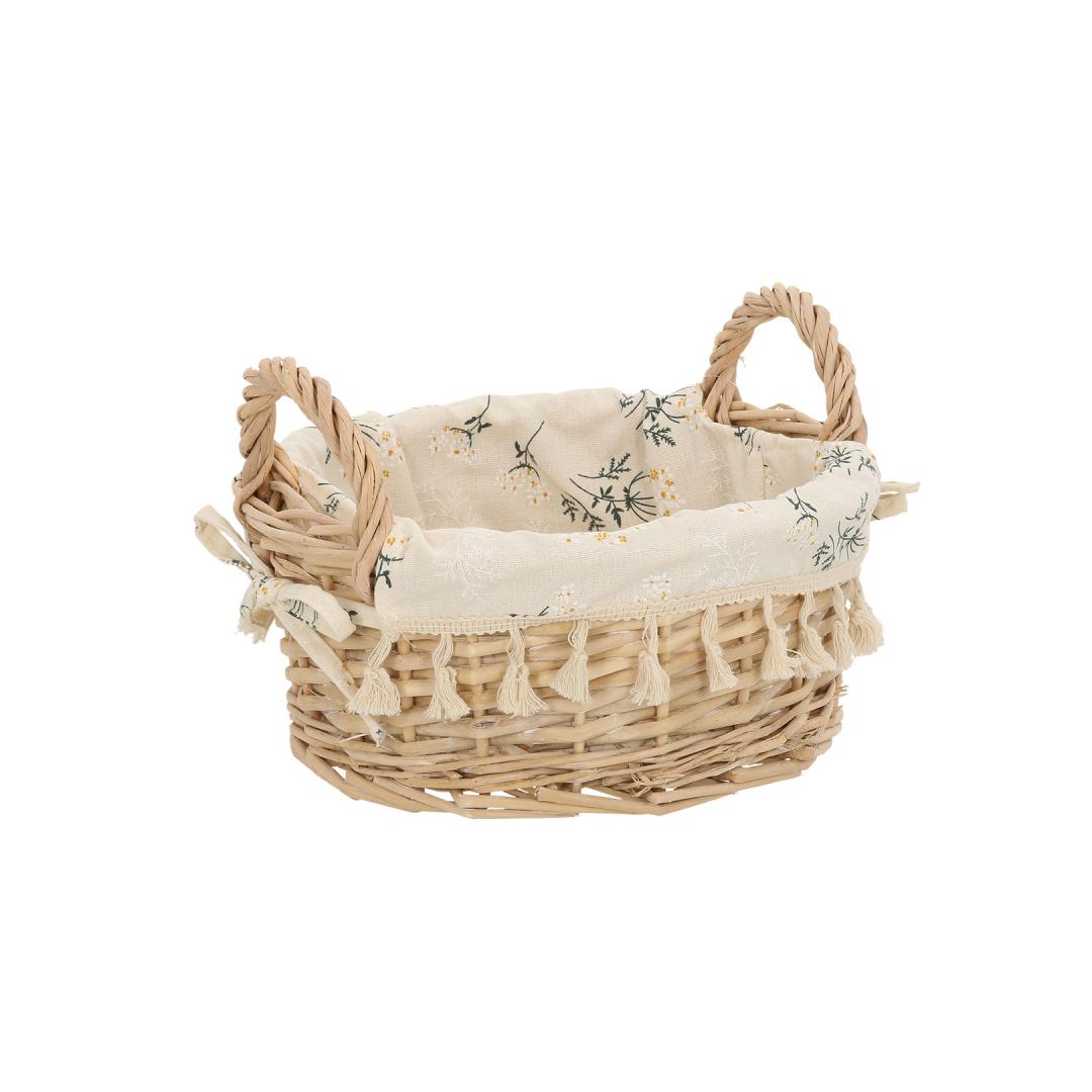 Tekstiilvooder: puuvillane lilleline kangas. Korvi materjal: käsitsi punutud naturaalne pajuvits.