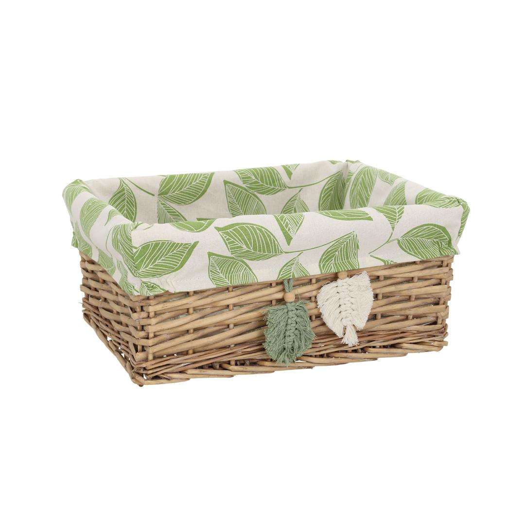 Tekstiilvooder: puuvillane roheliste lehtedega kangas. Korvi materjal: käsitsi punutud naturaalne pajuvits.
