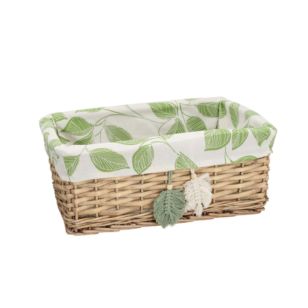 Tekstiilvooder: puuvillane roheliste lehtedega kangas. Korvi materjal: käsitsi punutud naturaalne pajuvits.