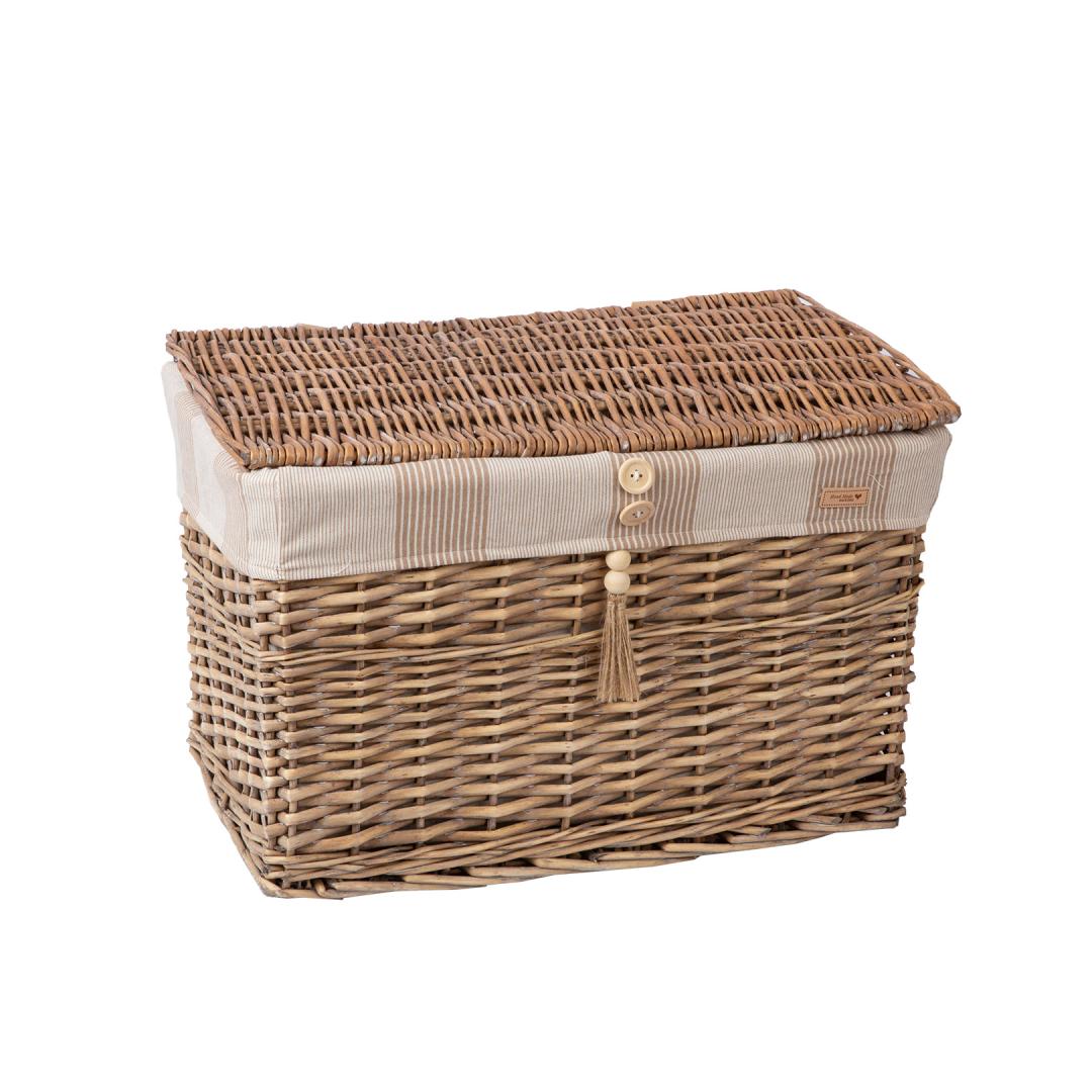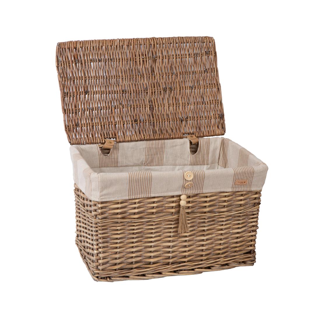 Tekstiilvooder: puuvillane triibuline kangas. Korvi materjal: käsitsi punutud naturaalne pajuvits.