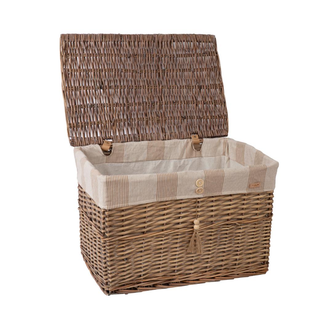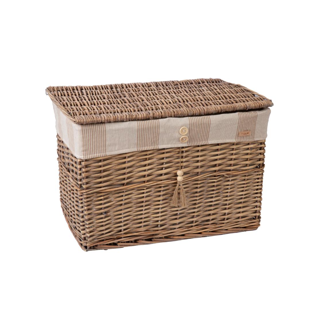 Tekstiilvooder: puuvillane triibuline kangas. Korvi materjal: käsitsi punutud naturaalne pajuvits.