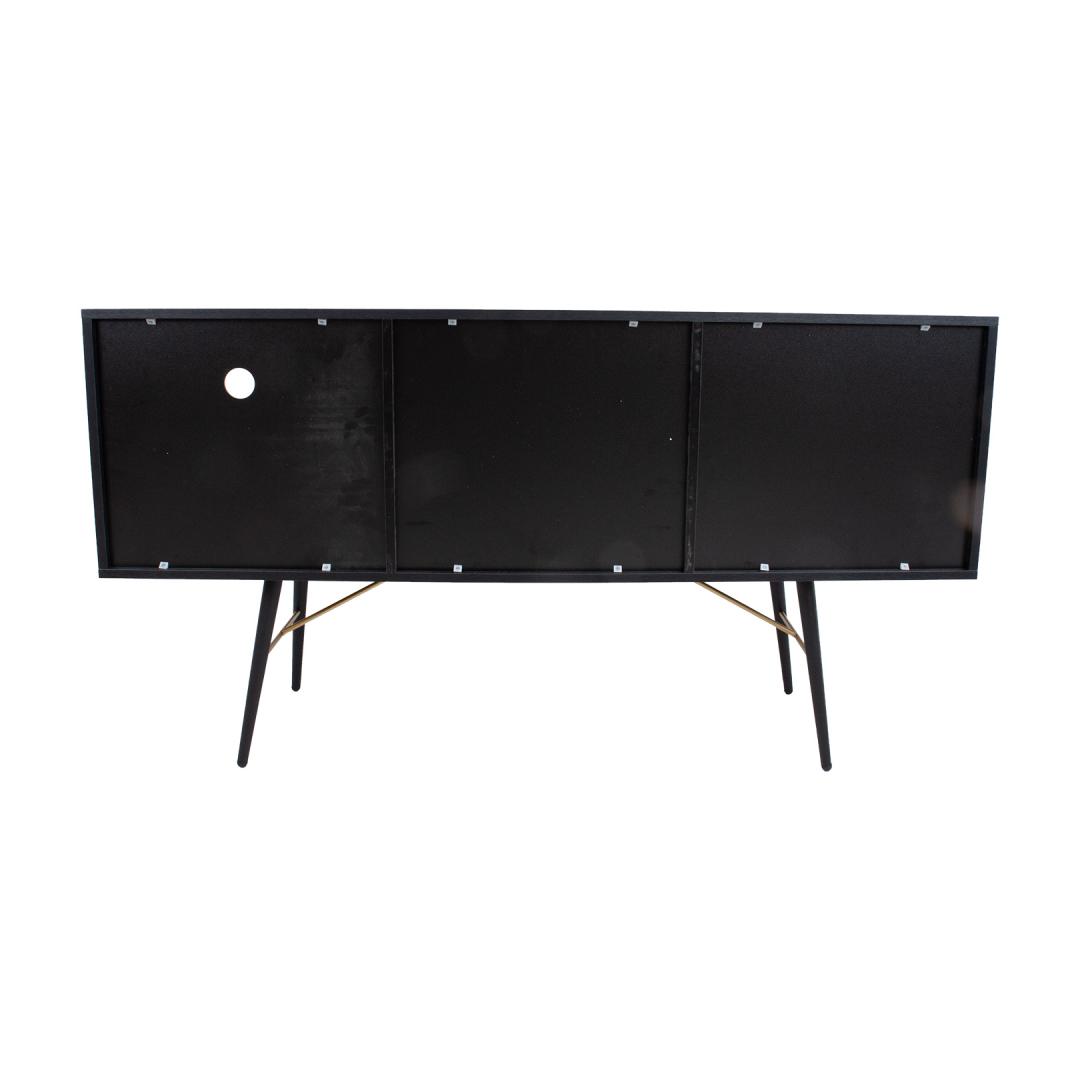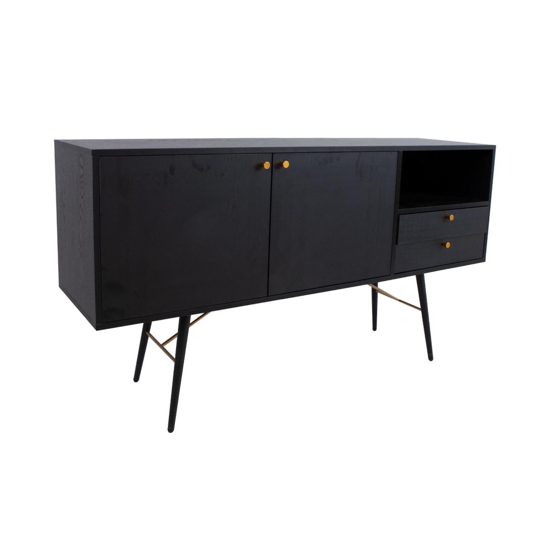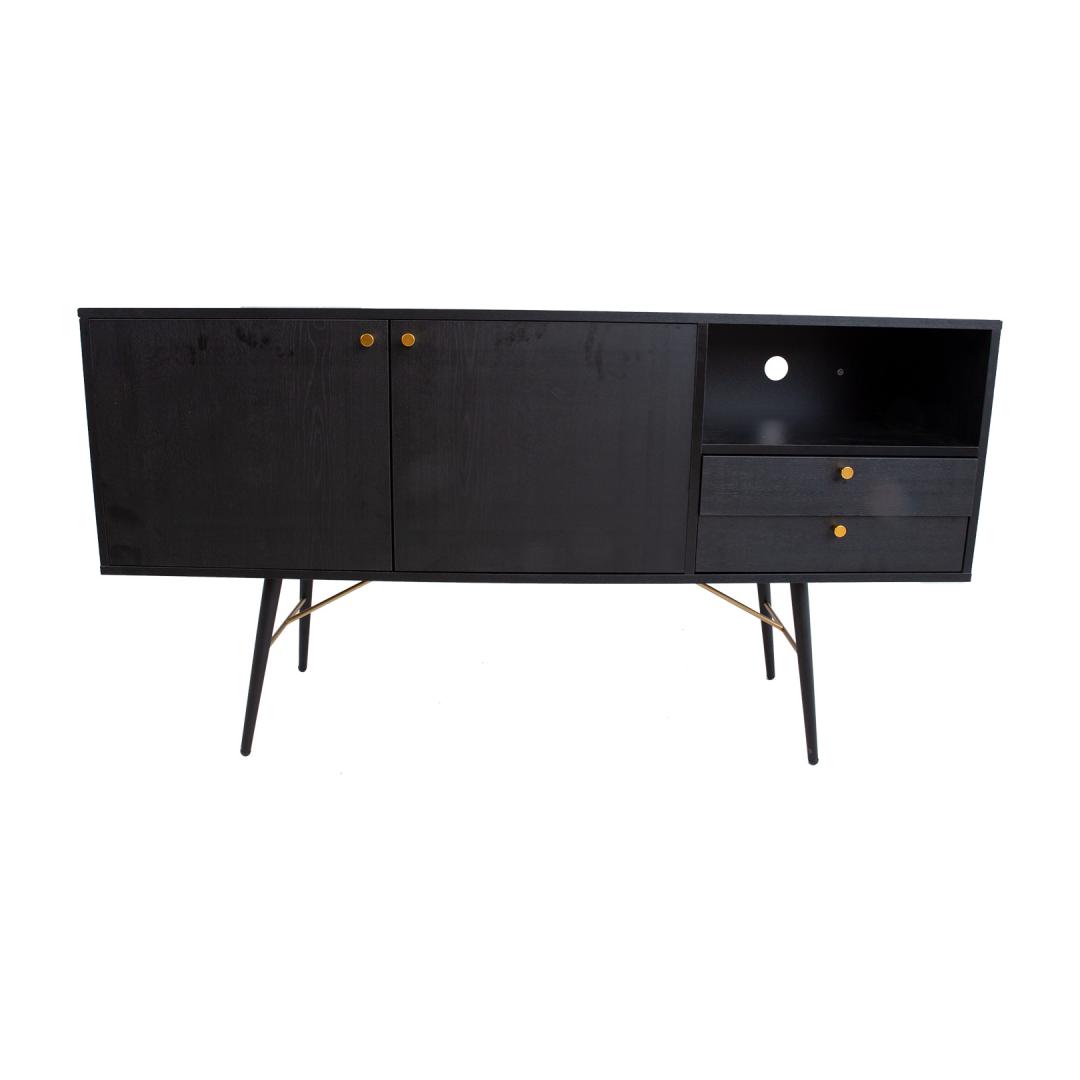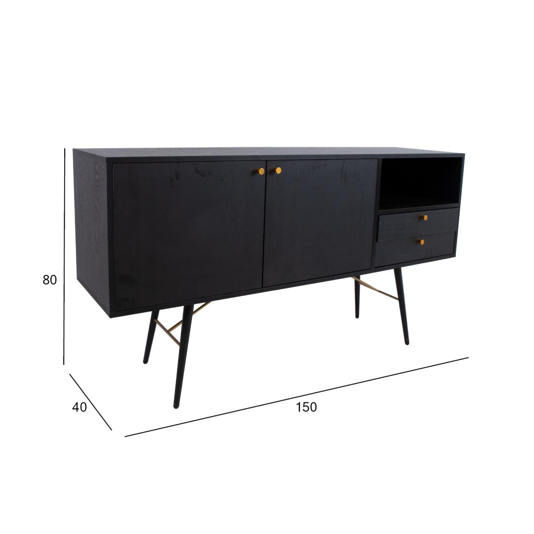 Kummut LUXEMBOURG 150x40xH80cm, must melamiin. Kummut on valmistatud puidudekooriga melamiinkattega mööbliplaadist. Jalgu seovad vasevärvi metallist detailid, mis annavad kummutile stiilse välimuse ja samas tagavad aluskonstruktsiooni tugevuse. Kummutil on kahe uksega kapp, kaks sahtlit ja üks avatud riiulivahe. Uksehinged ja sahtlisiinid on vaikselt sulguvad. Sahtlite ja uste nupud on vasevärvi alumiiniumist. Jalgade kõrgus on 35cm.