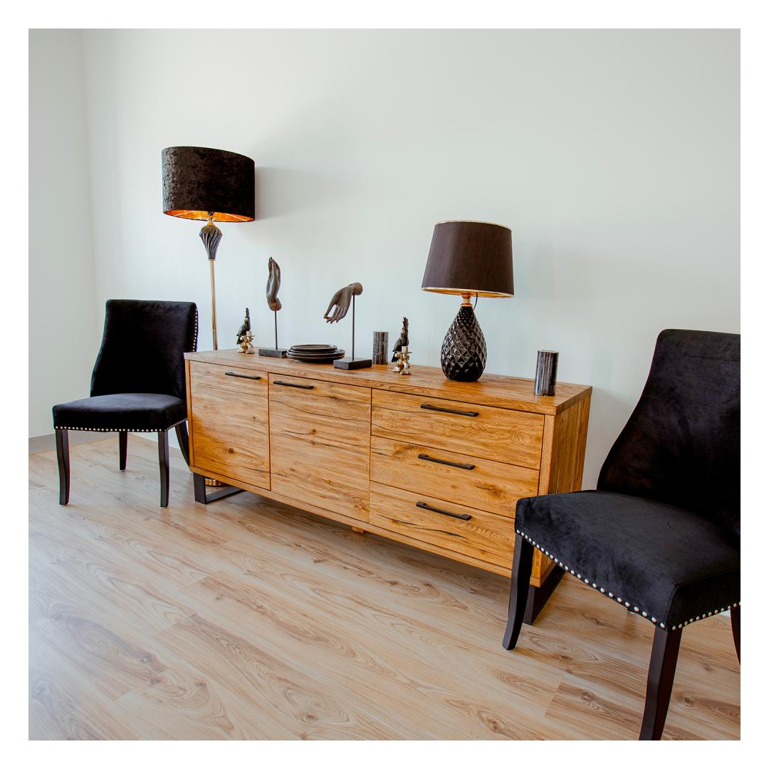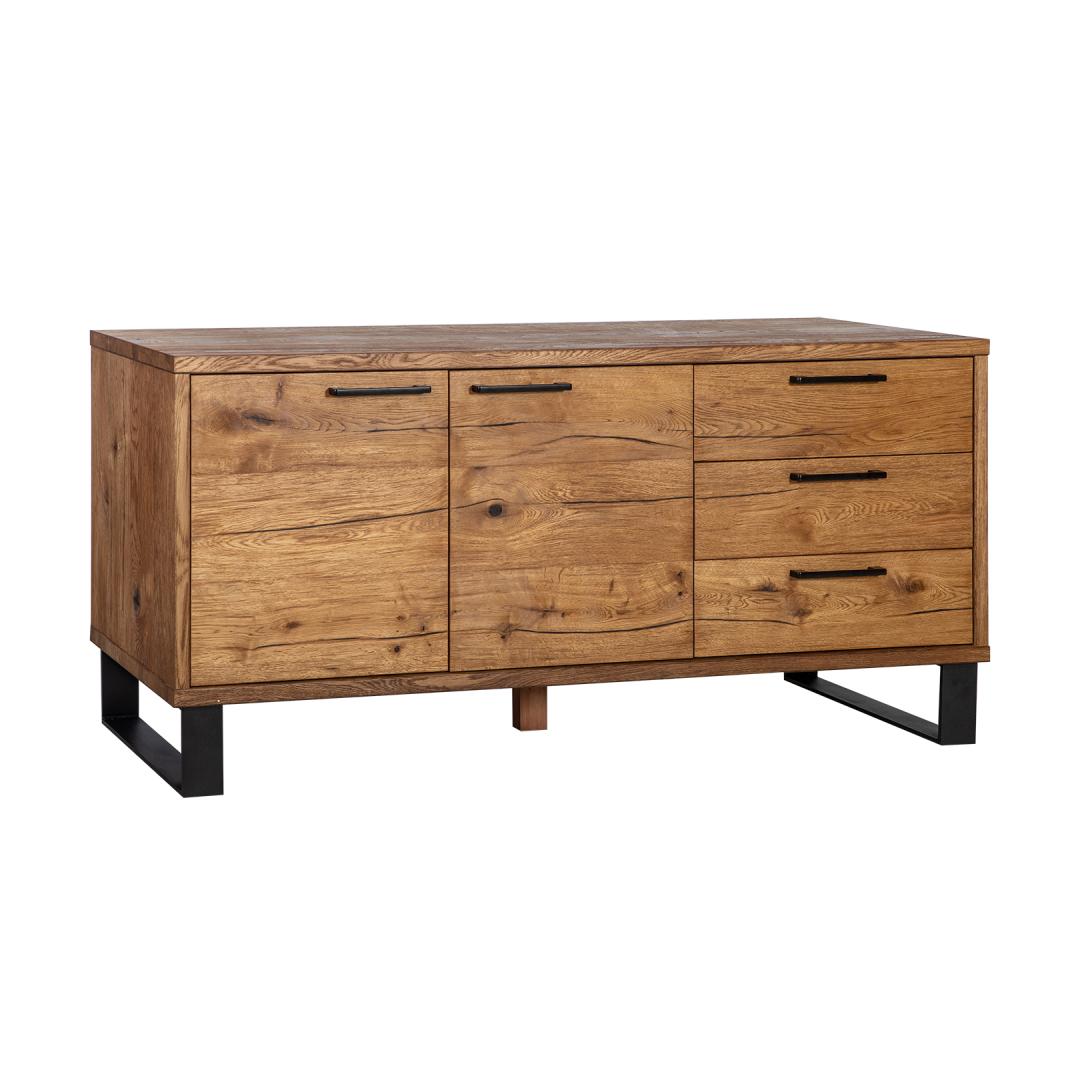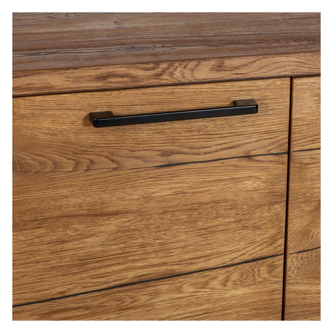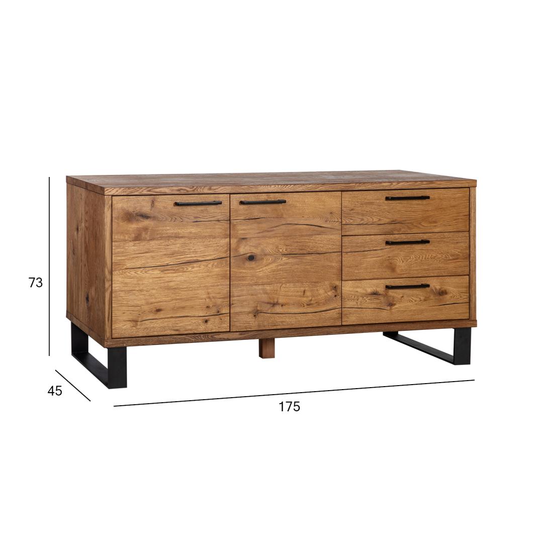 Kummut ROTTERDAM 3-sahtli ja 2-uksega 175x45xH73cm, tamm. Kummuti väliskorpus, uksed ja sahtlite esipaneelid on valmistatud mööbliplaadist ja kaetud naturaalse rustik tammespooniga. Rustik spoon on kirju ja elava struktuuriga. Suured oksakohad, pahteldatud lõhed ja rohke tooni varieerumine on lubatud. Kummut on viimistletud õliga. Sahtlid liiguvad puidust siinidel. Kahe poolega kapi mõlema ukse taga on üks vaheriiul. Kummuti alusraam on valmistatud metallist ja viimistletud musta pulbervärviga. Jalgade kõrgus 15cm.