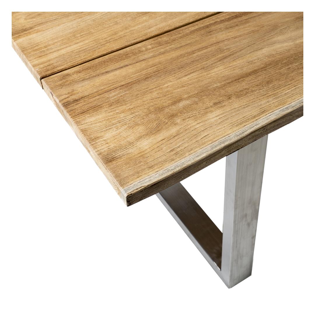 Laud NAUTICA 280x100xH76cm, tiikpuu. Kolmest paneelist koosnev servamata äärtega lauaplaat on valmistatud A-klassi tiikpuust. Peenlihvitud rustik viimistlusega pind on täielikult naturaalne oma looduslikus ilus ning seda ei ole õlitatud ega muul viisil keemiliselt töödeldud. Laua jalad ja alusraam on valmistatud roostevabast terasest. A-klassi tiikpuu on täiuslik looduslik materjal luksusliku õuemööbli valmistamiseks. Puidu süü on tihe ja ühtlane ning kauni sametise läikega, värvus on kuldse nisu-ja meetoonides. Tänu suurele looduslike õlide sisaldusele on tiikpuu väga vastupidav niiskuse ning puidukahjurite suhtes. Tiikpuu talub väga hästi erinevaid ilmastikutingimusi ja säilitab oma suurepärase välimuse ja parimad omadused pikkadeks aastateks. Päikesevalguse ja niiskuse mõjul muutub laua pind aja jooksul kaunilt hõbehalliks. Selline värvimuutus on loomulik ning ei mõjuta puidu kvaliteeti. Eksklusiivne tiikpuust laud sobib hästi ka siseruumides kasutamiseks. HOOLDUS: puhastage mööblit regulaarselt, kaitske liigniiskuse ja UV kiirguse eest. Puidust pindade värskendamiseks võib need soovikorral kergelt üle lihvida. HOIUSTAMINE: suvehooaja lõppedes soovitame aiamööblit hoiustada siseruumides. Puhastage ja kuivatage mööbel enne hoiule panekut. Kasutage hoiustamiseks kuiva ning hea ventilatsiooniga ruumi.