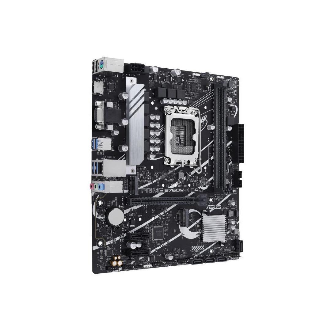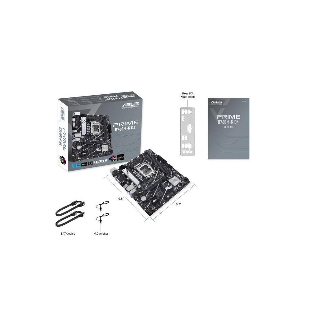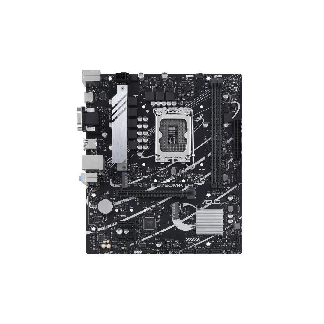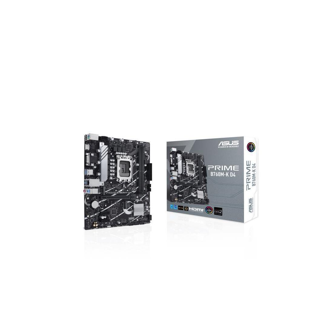 ASUS Prime B760M-K D4, an Intel® B760 LGA 1700 mATX motherboard with PCIe 4.0, two PCIe 4.0 M.2 slots, DDR4, Realtek 2.5Gb Ethernet, VGA, HDMI®, SATA 6 Gbps, front USB 3.2 Gen 1, Aura Sync