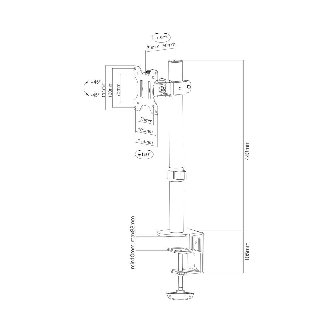 The Neomounts by Newstar desk mount, model FPMA-D510BLACK is a tilt-, swivel and rotatable desk mount for flat screens up to 32". This mount is a great choice for space saving placement on desks using a desk clamp or grommet mount. Neomounts by Newstar's versatile tilt (90°), rotate (360°) and swivel (180°) technology allows the mount to change to any viewing angle to fully benefit from the capabilities of the flat screen. Cable management conceals and routes cables from mount to flat screen. Hide your cables to keep the workplace nice and tidy. Neomounts by Newstar FPMA-D510BLACK has one pivot points and is suitable for screens up to 32". The weight capacity of this product is 8 kg. The desk mount is suitable for screens that meet VESA hole pattern 75x75 or 100x100mm. Different hole patterns can be covered using Neomounts by Newstar VESA adapter plates. By using an ergonomic mount neck- and back complaints can be avoided. Ideal for use in offices and on counters or in a reception area. All installation material is included with the product.