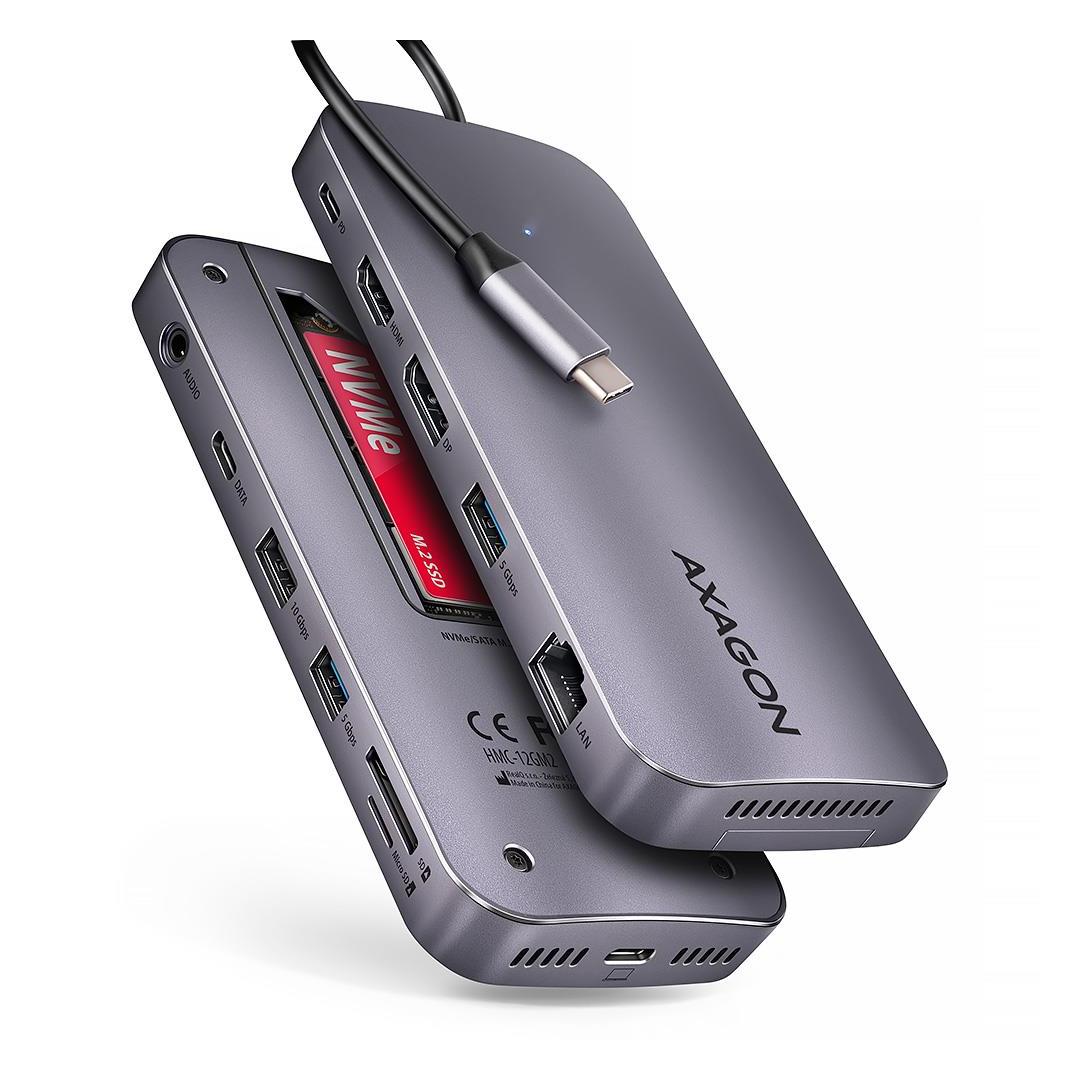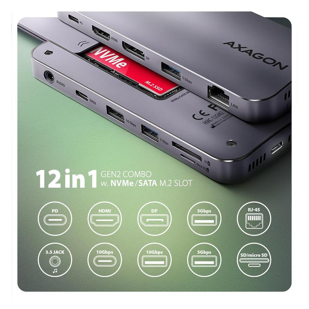Multiport USB-C 10Gbps hub AXAGON HMC-12GM2 GEN2COMBO 12in1 expands your laptop, computer or phone with eleven ports and external box for M.2 disk.