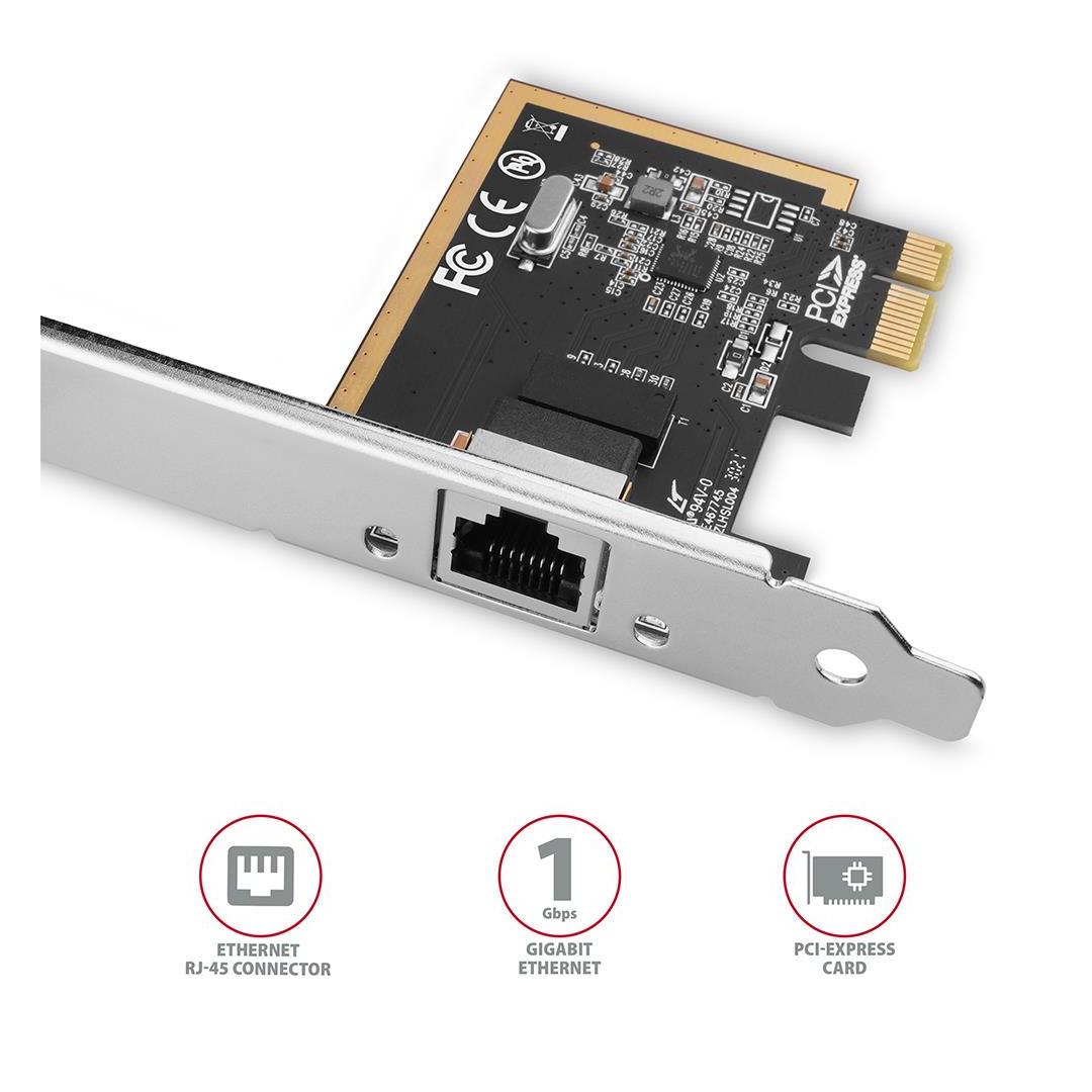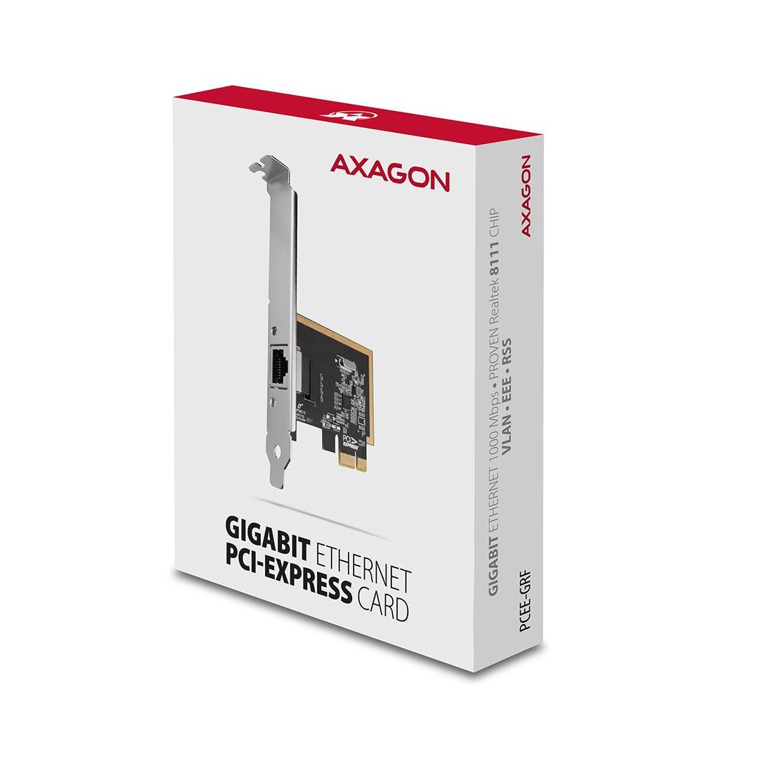 AXAGON PCEE-GRF PCI-Express network card adds high speed Gigabit Ethernet connection to your desktop computer. It enables a transmission speed of 10/100/1000 Mbit/s.