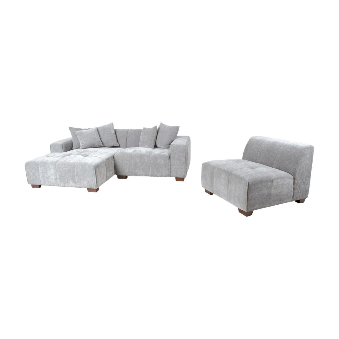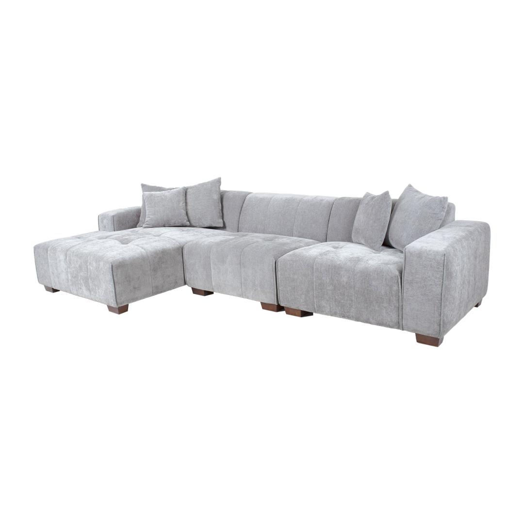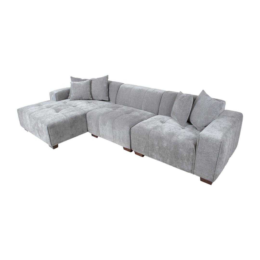 Komplekti kuulub 3+2 diivanipatja mõõtudega 55x55cm ja 42x42cm. Nurgadiivan DAHLIA vasak nurk, helehall.