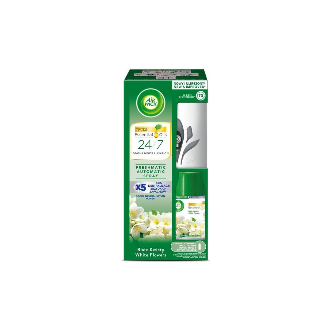 Automaatne õhuvärskendaja valgete lillede lõhnaga. Õhuvärskendaja eraldab kindla ajavahemiku järel – iga 9, 18 või 36 minuti tagant – automaatselt värske ja kerge aroomi. Õhuvärskendaja Freshmatic komplekt White Flowers 250ml, AIR WICK, 1 tk