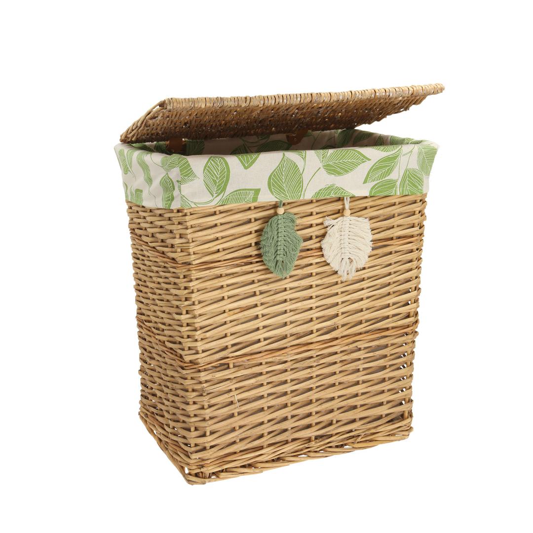 Tekstiilvooder: puuvillane roheliste lehtedega kangas. Korvi materjal: käsitsi punutud naturaalne pajuvits.