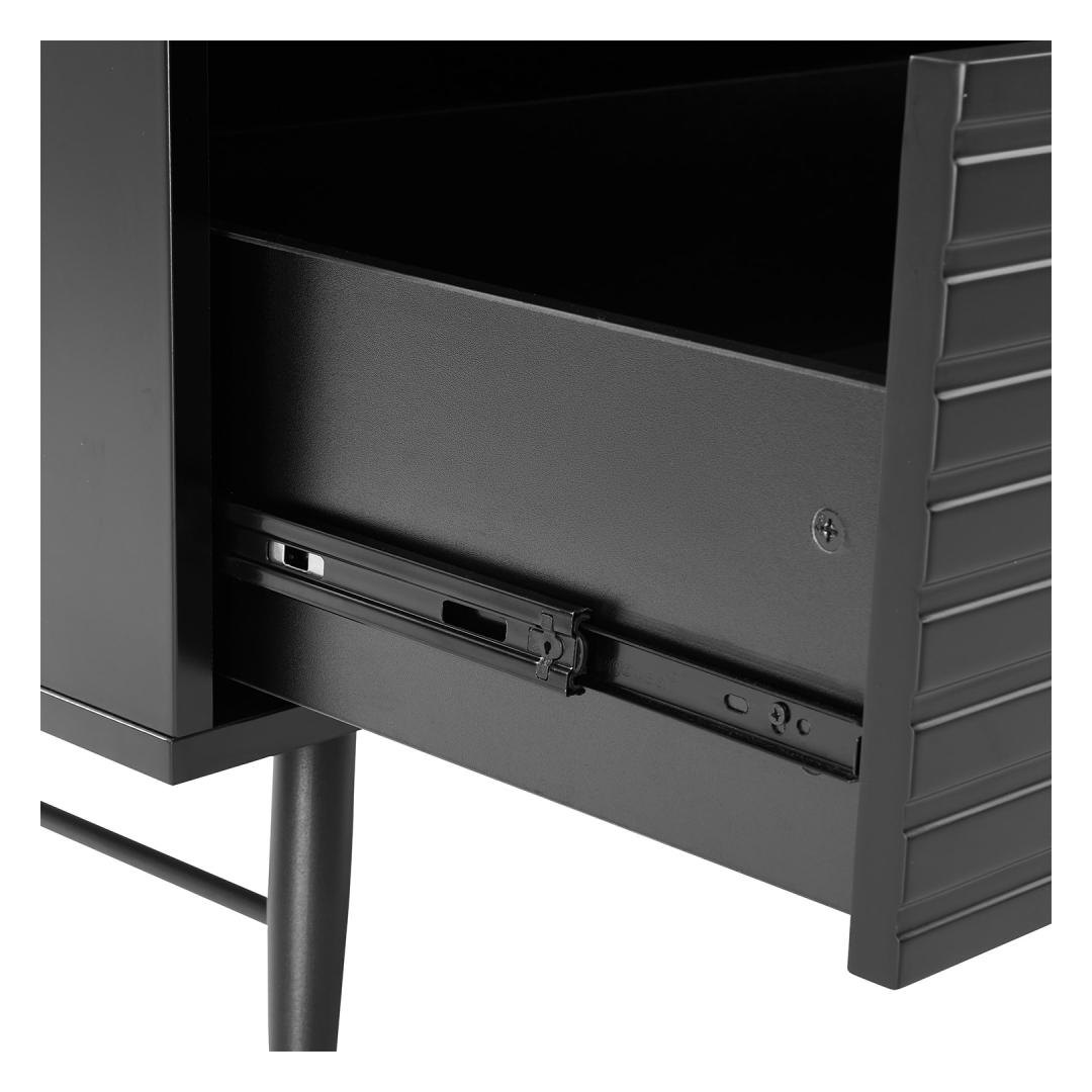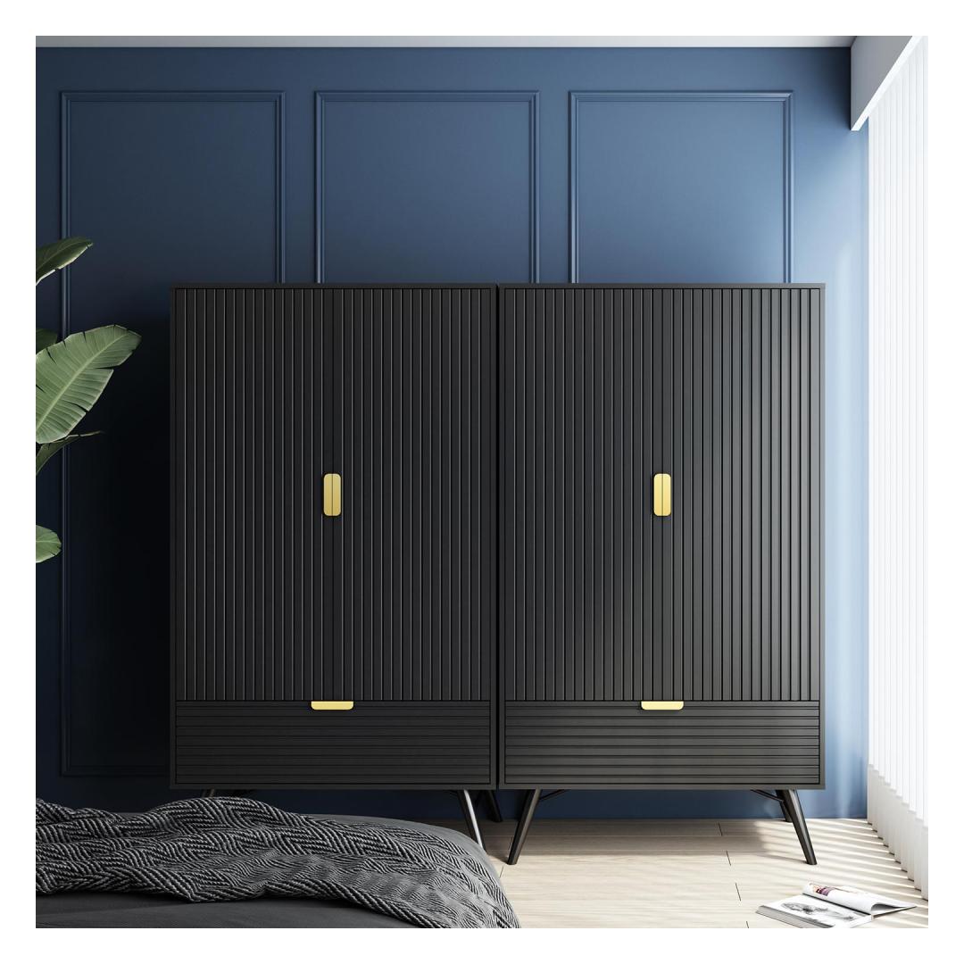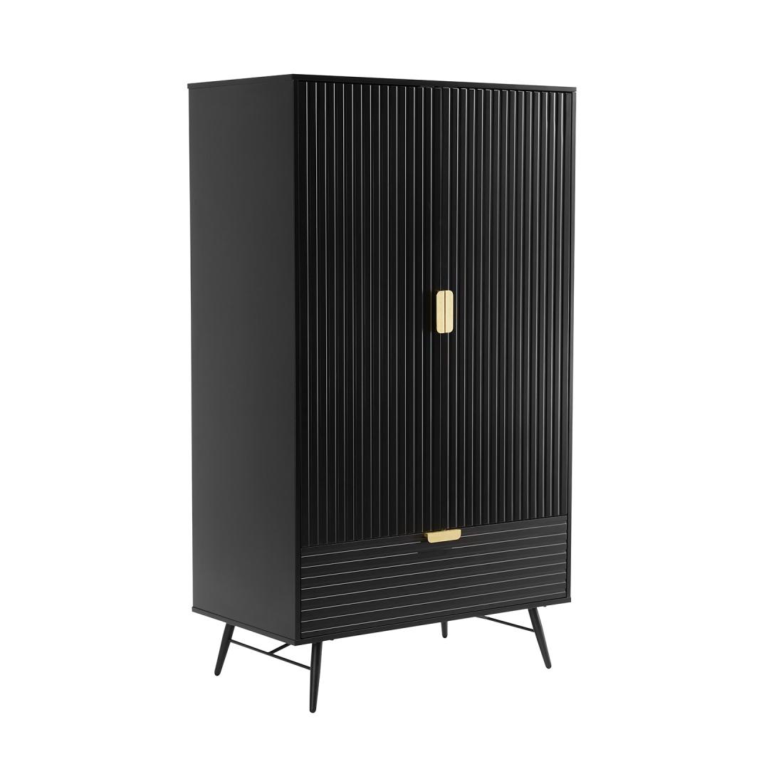Riidekapp PIXAR 2-ukse ja sahtliga 100x56xH175cm, must. Mööbliplaadist valmistatud riidekapp on viimistletud musta polüuretaanvärviga. Ribipaneelist uste ja sahtli esipaneelid ning kuldsed käepidemed annavad pilkupüüdva välimuse. Kapi jalad ja alusraam on valmistatud metallist. Riidekapp PIXAR 2-ukse ja sahtliga 100x56xH175cm, must. Mööbliplaadist valmistatud riidekapp on viimistletud musta polüuretaanvärviga. Ribipaneelist uste ja sahtli esipaneelid ning kuldsed käepidemed annavad pilkupüüdva välimuse. Kapi jalad ja alusraam on valmistatud metallist.