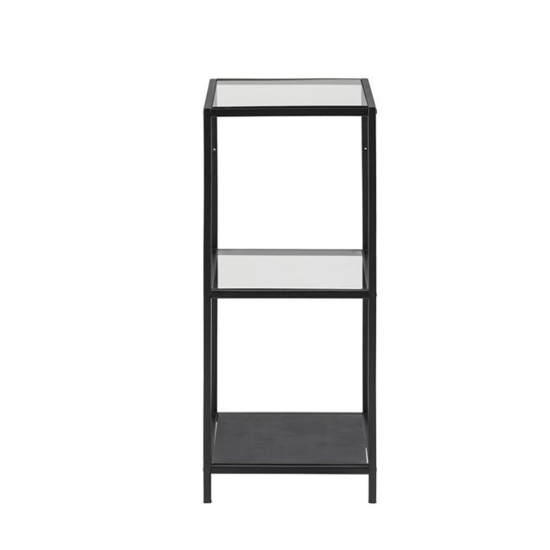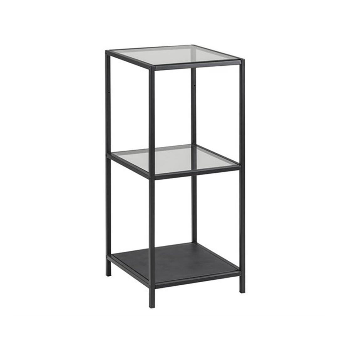 Riiul SEAFORD 35x37xH82,5cm, klaas. Maitsekat ja praktilist riiulit on võimalik kasutada erinevates ruumides asjade mugavaks hoiustamiseks. Riiulid on valmistatud läbipaistvast ja matist musta värvi klaasist, mis on 5mm paks. Raam on valmistatud musta värvi metallist. Toote mõõdud on 35x37xH82,5cm.