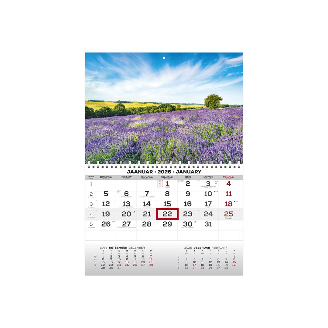Mõõt: 297 x 420 mm Spiraalköide Riputusauk Sisu maht 12 lehte Kuupäevamärkija Sisu tumehall / punane Keel: eesti ja inglise Kalendaarium sisaldab järgmist: Riigipühad, riiklikud ja rahvakalendri tähtpäevad, lipupäevad, 37 riigi riigipühad lühenditega, suve- ja talveajale üleminek, päikese tõusu ja loojangu kellaajad (Tallinn), kuu faasid kellaaegadega, sodiaagimärgid, aastaaegade algused kellaaegadega, eelnev ja järgnev kuu, nädala number.