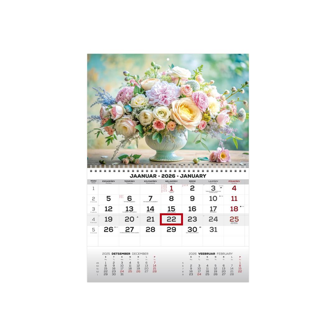 Mõõt: 297 x 420 mm Spiraalköide Riputusauk Sisu maht 12 lehte Kuupäevamärkija Sisu tumehall / punane Keel: eesti ja inglise Kalendaarium sisaldab järgmist: Riigipühad, riiklikud ja rahvakalendri tähtpäevad, lipupäevad, 37 riigi riigipühad lühenditega, suve- ja talveajale üleminek, päikese tõusu ja loojangu kellaajad (Tallinn), kuu faasid kellaaegadega, sodiaagimärgid, aastaaegade algused kellaaegadega, eelnev ja järgnev kuu, nädala number.