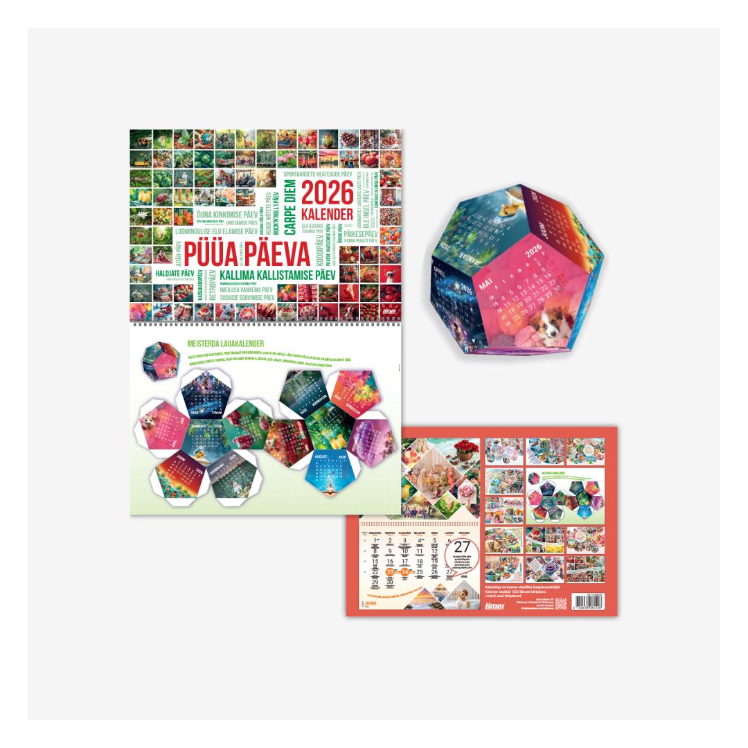 1000 lõbusat tähtpäeva! Kaasas juhend põneva kalendripalli valmistamiseks. Mõõt: 420 x 300 mm Spiraalköide Riputusauk Staatiline kuupäevamärkija Keel: eesti ja inglise Kalendaarium sisaldab järgmist: Riigipühad, riiklikud tähtpäevad, lipupäevad, aastaaegade algused kellaaegadega, erinevad vaimukad tähtpäevad, nädala number.