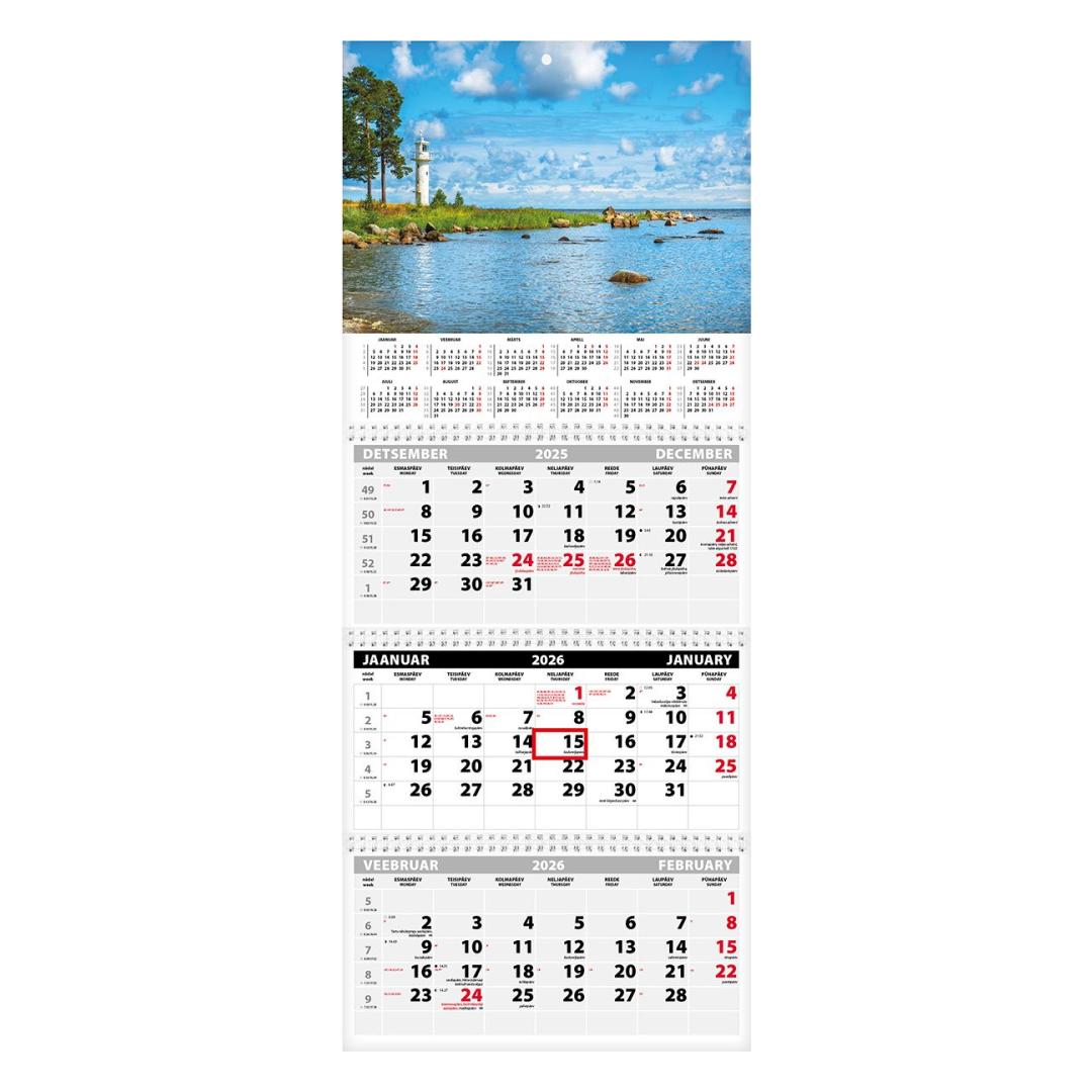 Kolme kuu vaate ja kolme spiraaliga seinakalender. Avatud mõõt koos pildiga 297x640mm. Punane staatiline kuupäevamärkija. Kalendaarium sisaldab riigipühi, riiklikke ja rahvakalendri tähtpäevi, lipupäevi, 42 riigi pühi lühenditena, päikese tõusu ja loojangu aegu, kuu faase, aastaaegade alguseid. Päeva ja kuu nimed eesti ja inglise keeles. Tellides oma pildi ja/või reklaamribaga hind muutub.