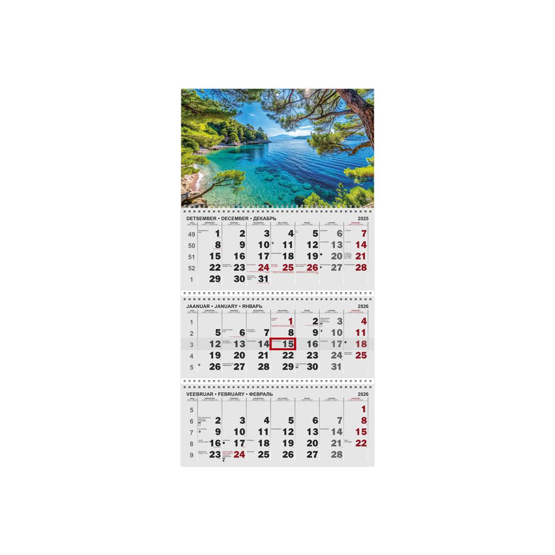 Mõõt: 340 x 650 mm Kolmeosaline spiraalköide Metallist kinnitusrims riputusaasaga Sisu maht 3 x 12 lehte Kuupäevamärkija Sisu tumehall / punane Keel: eesti, inglise, vene Kalendaarium sisaldab järgmist: 37 riigi riigipühad, riiklikud ja rahvakalendri tähtpäevad, lipupäevad, lühendatud tööpäevad, kaduneljapäevad, kuu faasid, sodiaagimärgid, aastaaegade algused kellaaegadega, eelnev ja järgnev kuu, nädala number.