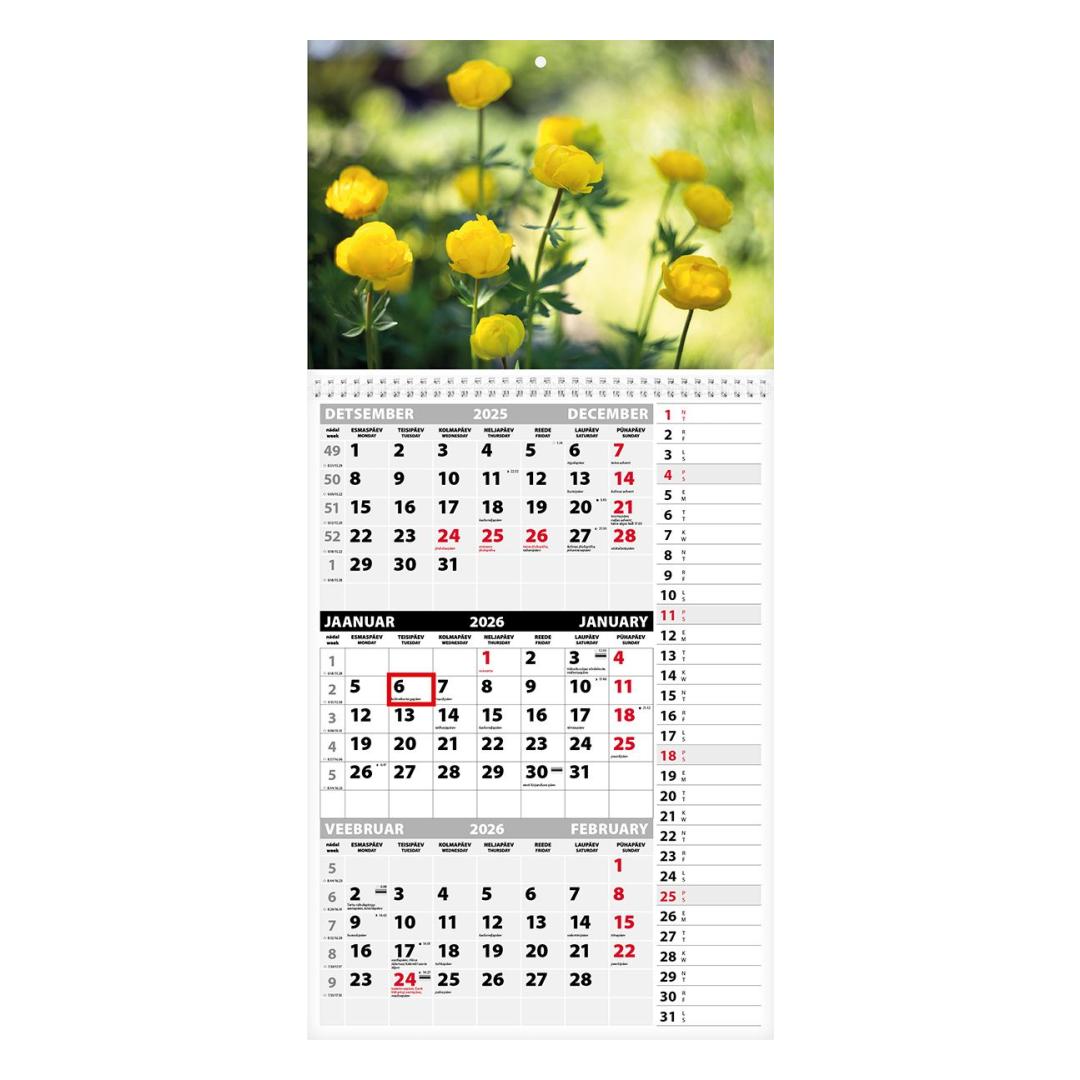 Kolme kuu vaatega seinakalender. Avatud mõõt koos pildiga 297x630mm. Punane staatiline kuupäevamärkija. Kalendaarium sisaldab riigipühi, riiklikke ja rahvakalendri tähtpäevi, lipupäevi, 42 riigi pühi lühenditena, päikese tõusu ja loojangu aegu, kuu faase, aastaaegade alguseid. Päeva ja kuu nimed eesti ja inglise keeles. Lehe parempoolsel küljel päevalahtrid sünnipäevade või sündmuste märkimiseks. Tellides oma pildi ja/või reklaamribaga hind muutub.
